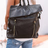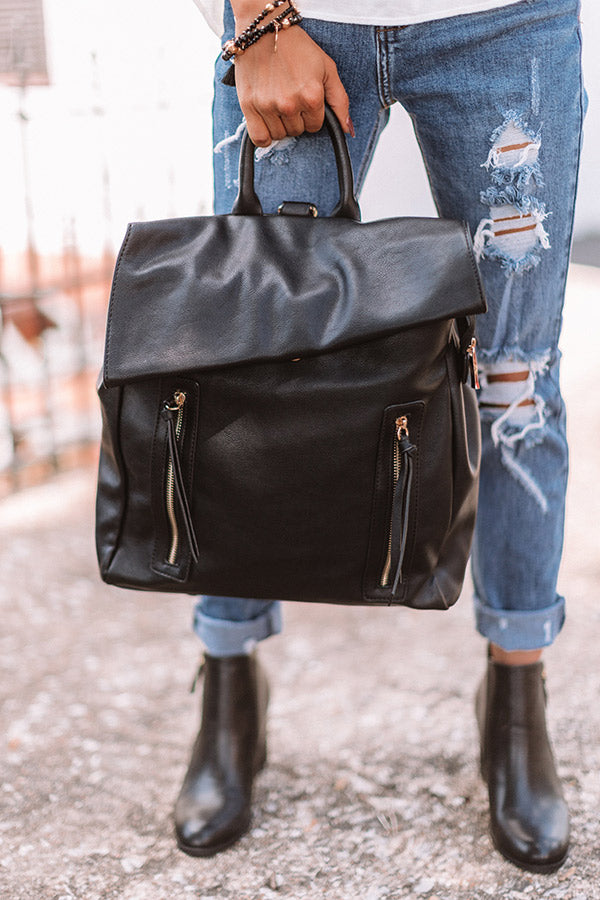 When headed for your "Swiss Alps getaway," you won't find a better travel accessory that is both functional and fashionable than this black backpack featuring a tote handle, a faux leather material, adjustable and removable shoulder straps, a flap and snap button closure, two accent gold zippers, and a spacious fully lined pouch with a zip closure and additional pockets!