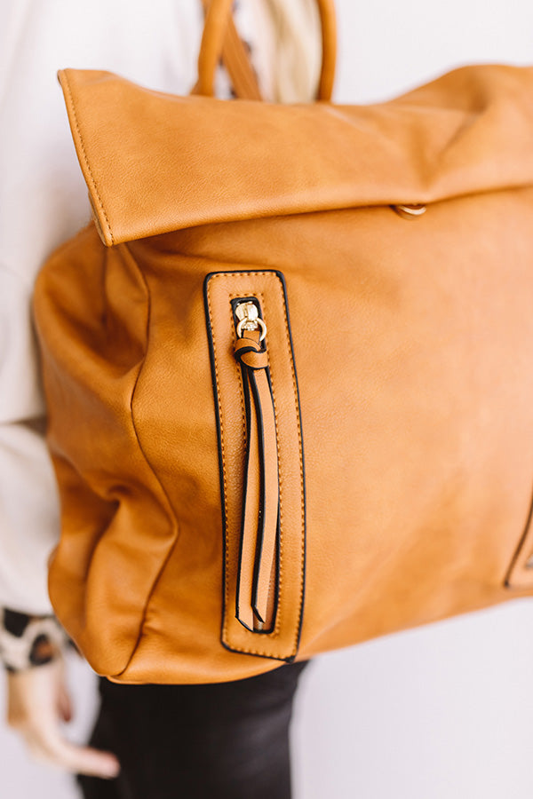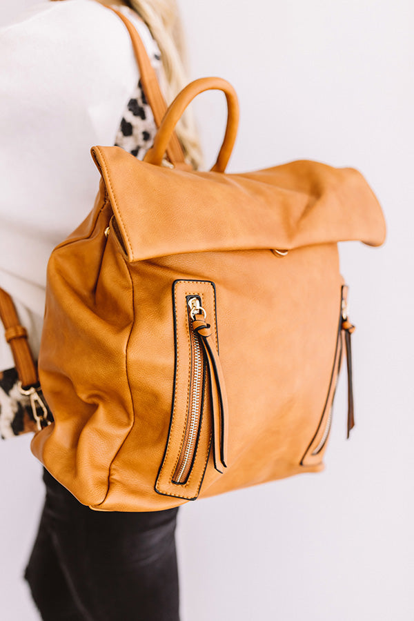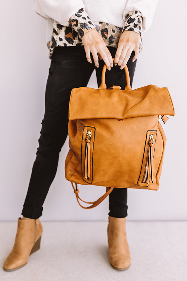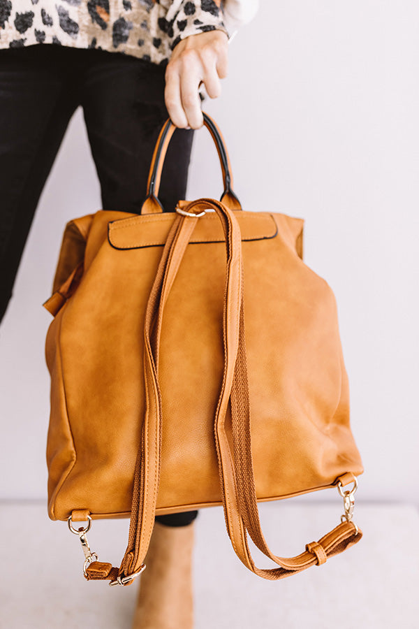 When headed for your "Swiss Alps getaway," you won't find a better travel accessory that is both functional and fashionable than this maple colored backpack featuring a tote handle, a faux leather material, adjustable and removable shoulder straps, a flap and snap button closure, two accent gold zippers, and a spacious fully lined pouch with a zip closure and additional pockets!