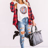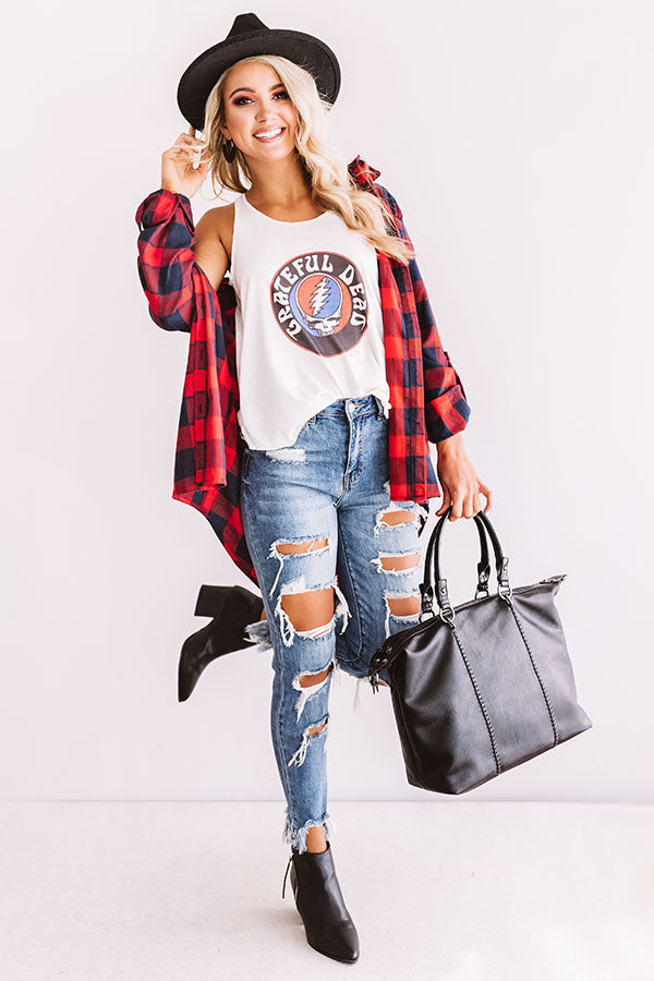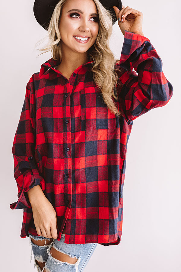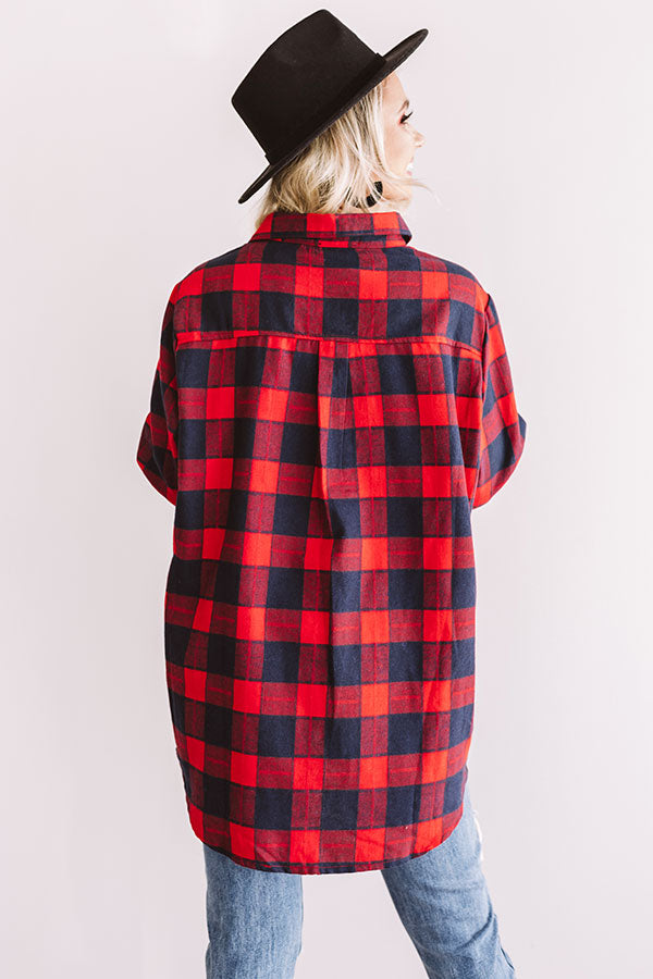 If you're mad for plaid, then don't forget to pack this cold weather top for your "Swiss Alps getaway!" It features a red and navy plaid pattern, lightweight material, a collared neckline, long loose sleeves with button closure cuffs that can be rolled, a chest accent pocket, and a relaxed button up bodice with rounded tunic length hemline! This piece can be worn closed or open over a boyfriend tank with some distressed ankle skinnies and a black pointed bootie, tote, and faux suede hat, or you can tuck it into a denim skirt with "The Hadid Bootie" and our "Cocktail Queen Earrings in Navy!" Measurements