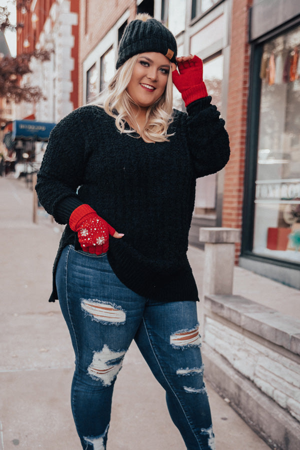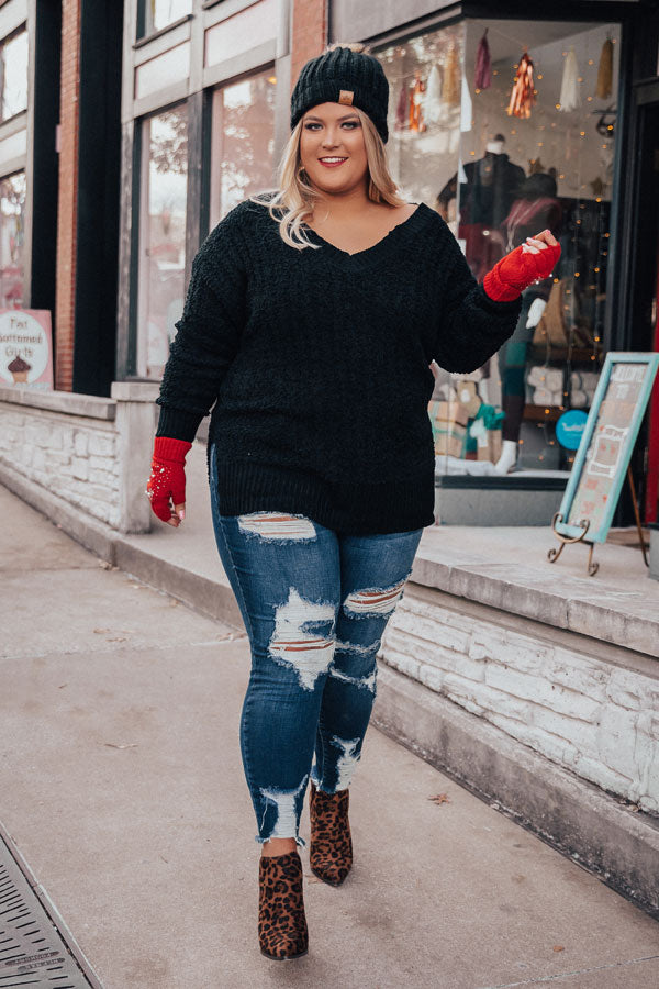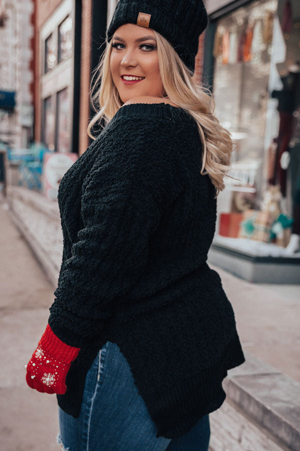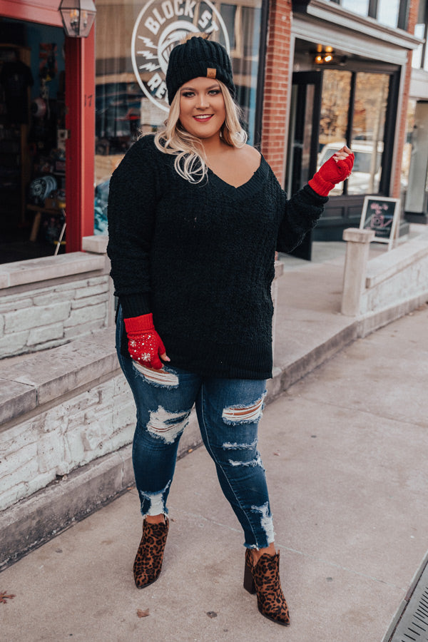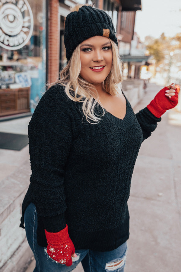 Plus Size - Stay warm and protected from those chilly "Swiss flurries" with this adorable black sweater featuring soft lightweight material with popcorn knit texturing, a wide v-cut neckline, long loose sleeves with fitted cuffs, and a relaxed silhouette that falls into a straight tunic length hemline with high side slits! We have styled this cold weather cutie with some distressed ankle skinnies, leopard booties, red gloves, and a matching beanie, but you can also wear it with some black flares and colored accents like our "Style Profile Faux Leather Wedge in Blush" and "The Saylie Faux Suede Peep Toe Heel in Blush!" Measurements