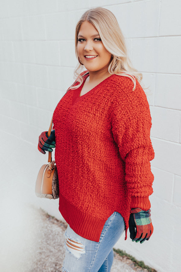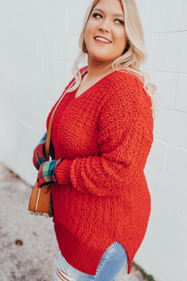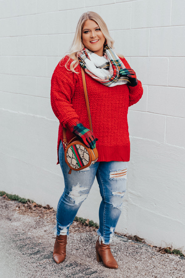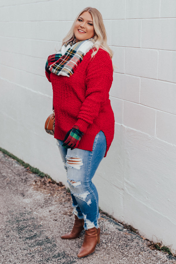Plus Size - Stay warm and protected from those chilly "Swiss flurries" with this adorable red sweater featuring soft lightweight material with popcorn knit texturing, a wide v-cut neckline, long loose sleeves with fitted cuffs, and a relaxed silhouette that falls into a straight tunic length hemline with high side slits! We have styled this cold weather cutie with some distressed ankle skinnies, a plaid scarf, and a matching neutral snake print crossbody and bootie, but you can also wear it with some black flares, "The Parker Faux Suede Lace Up Heel in Scarlet," and "The Aurora Hat in Black!" Measurements