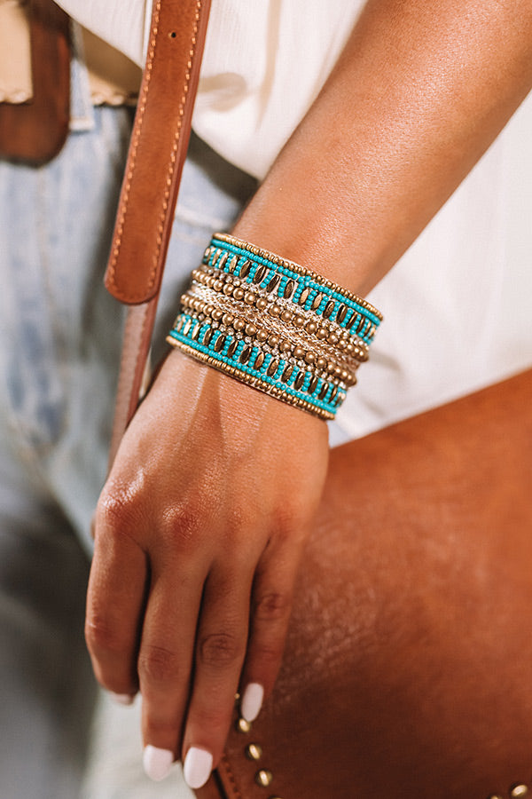 We don't blame you for swooning over this stunning statement bracelet featuring a wide adjustable cuff with turquoise and gold beaded embellishing!