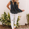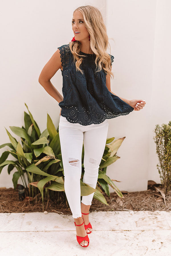 This femme and flirty sleeveless top has crochet laced sleeves and a breezy eyelet pierced bodice with a scalloped hem! This shirt is unlined, but looks great styled with a bralette or cami underneath!