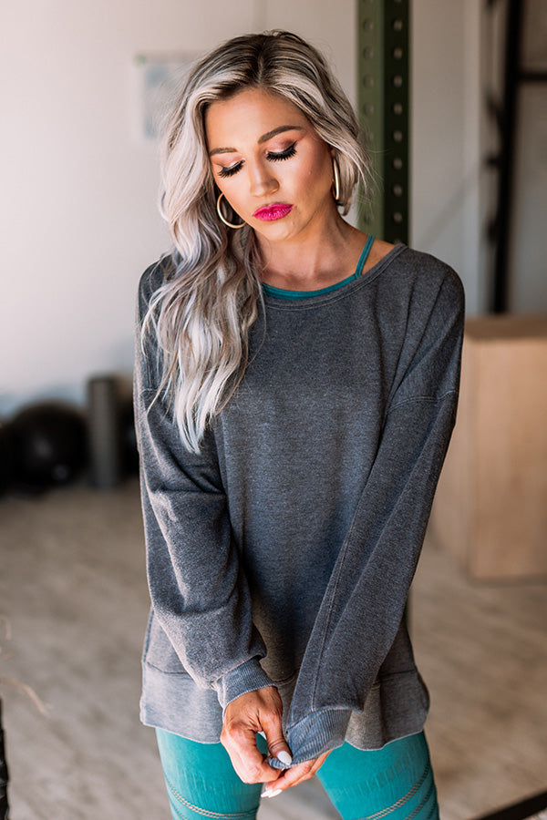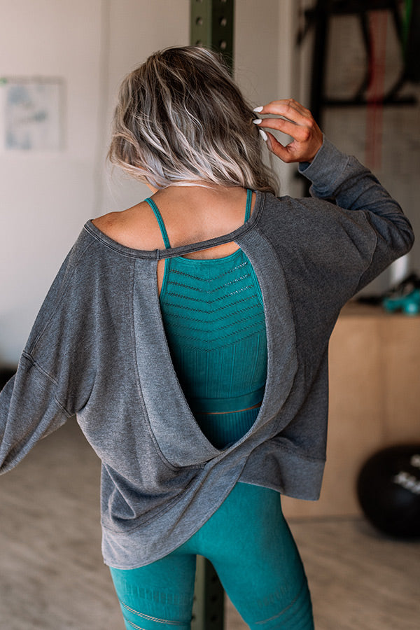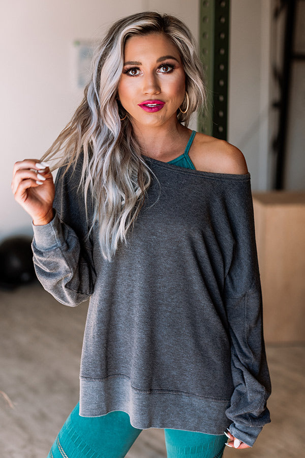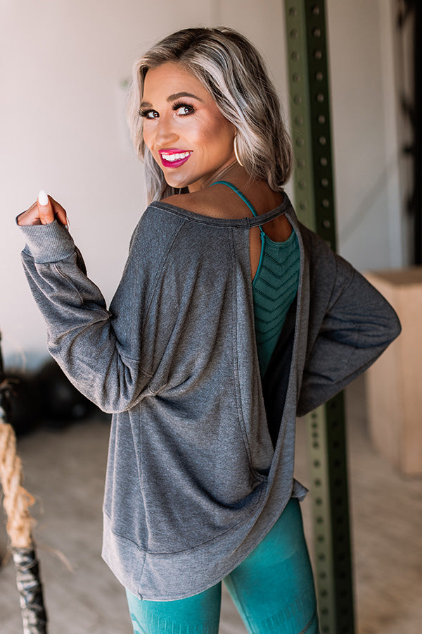 There is no better piece to throw and go in than our charcoal colored 'Sync Up' sweatshirt featuring soft lightweight material, long loose sleeves with more fitted cuffs, a deep wrapped open back with a upper strap closure, a wide rounded neckline that can be worn off one shoulder, and an ultra slouched silhouette that falls into a straight front hemline! Measurements