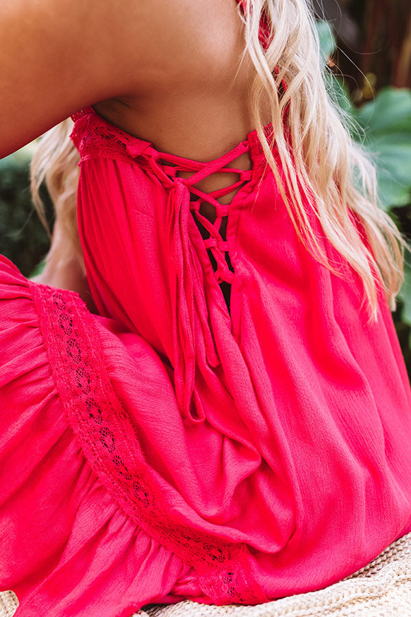 Twirl through summer in this flirty red shift dress featuring lightweight breezy material, intricate crochet detailing across the straight neckline and 1-inch sleeveless shoulder straps, lace up closures on each side, and an ultra relaxed silhouette that falls into an uneven mid-thigh length peplum hemline! We have styled this darling piece with a blue wedge and woven hat, but you can also wear it with our white "Flake Slip On Sneaker" and our "City Chic Faux Leather Tote in White" for the ultimate casual backyard hang out look! Measurements