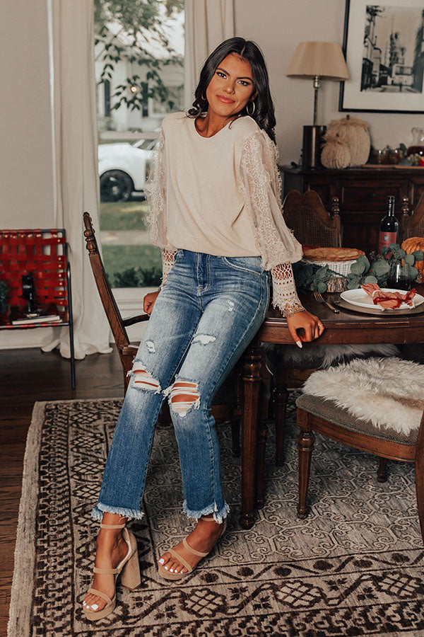 People will stare, make it worth their while in our elegant champagne colored 'Take A Chance On Love' top featuring soft lightweight material, a high rounded neckline, long loose semi-sheer bishop sleeves with intricate lace detailing and fitted forearm cuffs, and a relaxed silhouette that falls into a straight hemline!