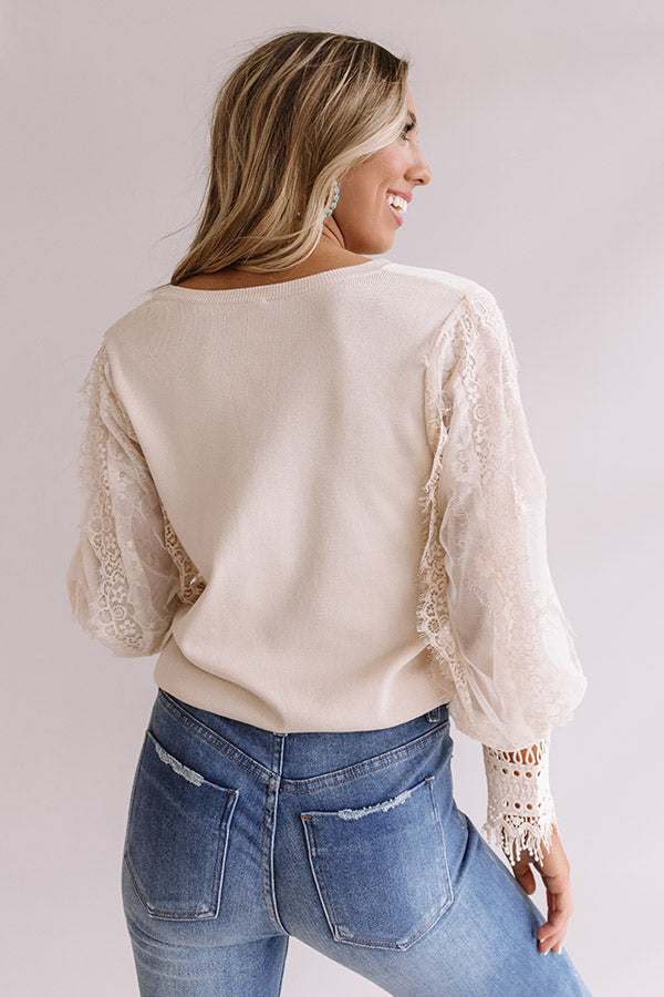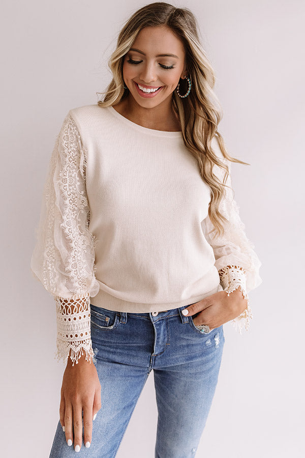 People will stare, make it worth their while in our elegant cream colored "Take A Chance On Love" top featuring soft lightweight material, a high rounded neckline, long loose semi-sheer bishop sleeves with intricate lace detailing and fitted forearm cuffs, and a relaxed silhouette that falls into a straight hemline! We have styled this charming piece with some frayed ankle skinnies, matching heels, and a neutral tote, but you can also wear it with some distressed shorts, "The Underwood Faux Leather Wedge in Natural," and our "Classic Moment Wool Hat in Iced Latte!" Measurements