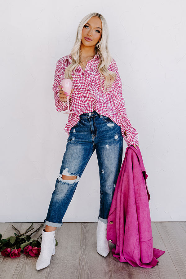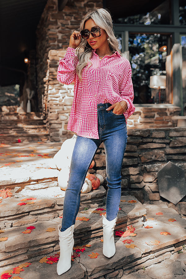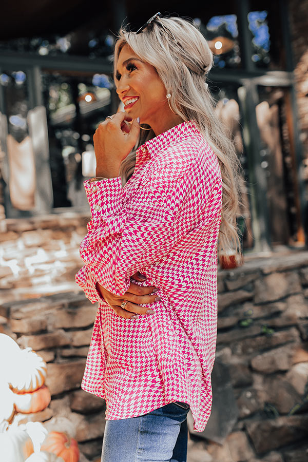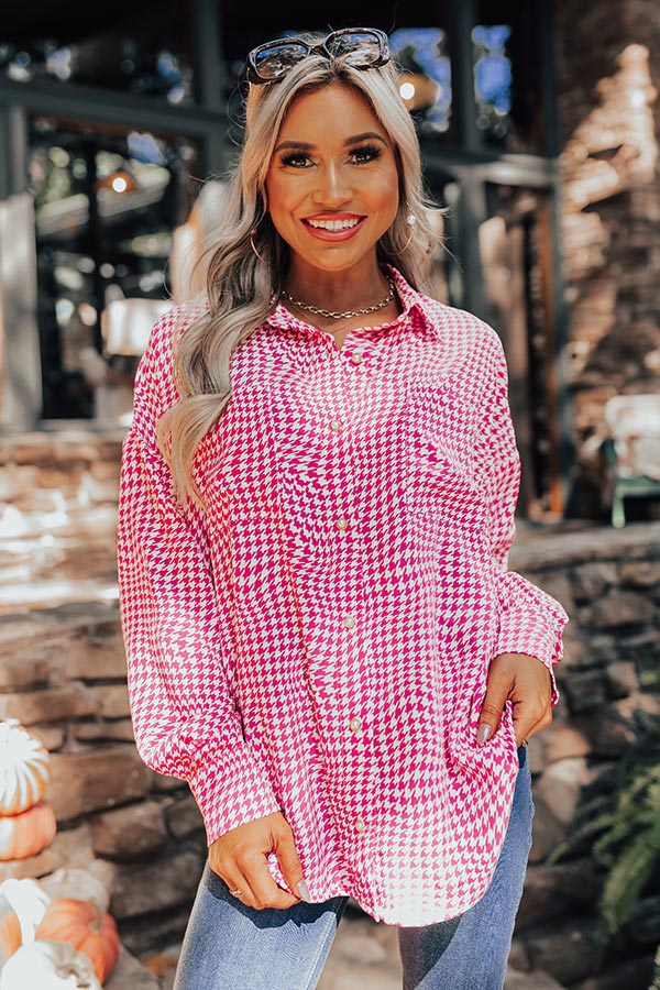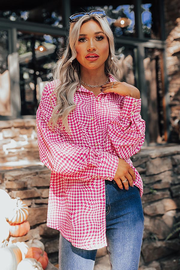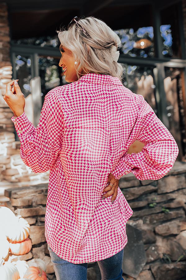 Strike a pose in this gorgeous trendy top! Featuring lightweight hot-pink and white houndstooth print material, a collared neckline that goes down into a button down front with beautiful gold and pearl buttons, two chest pockets, long loose sleeves with buttoned cuffs, and a relaxed silhouette that falls into a rounded hemline.
