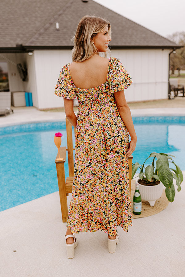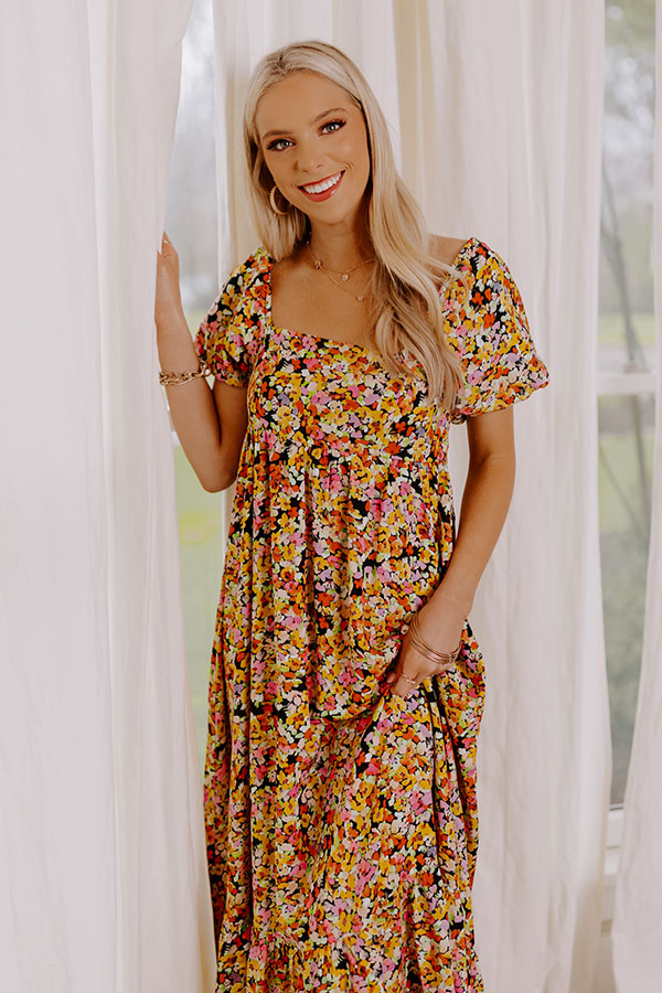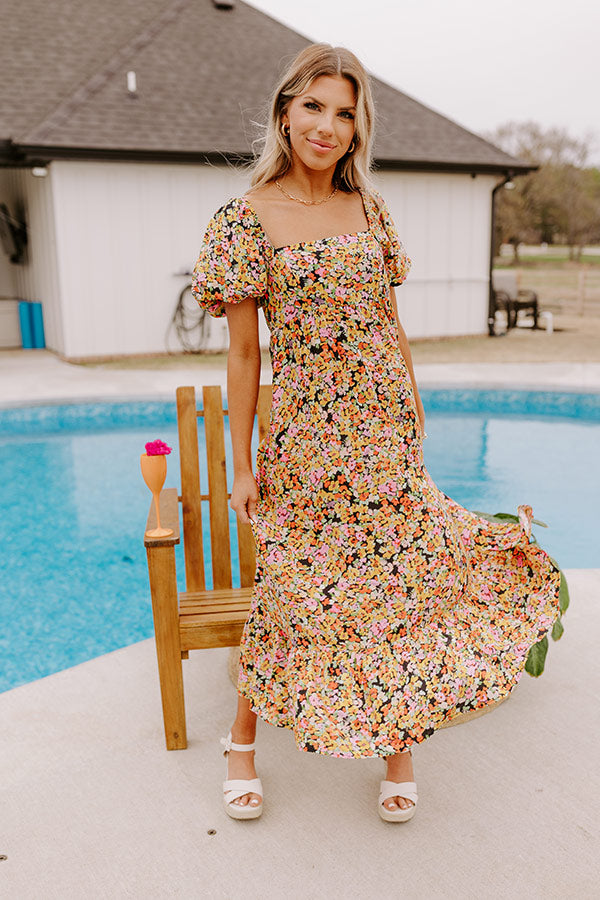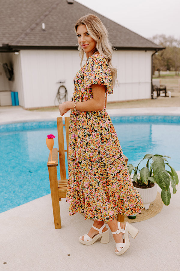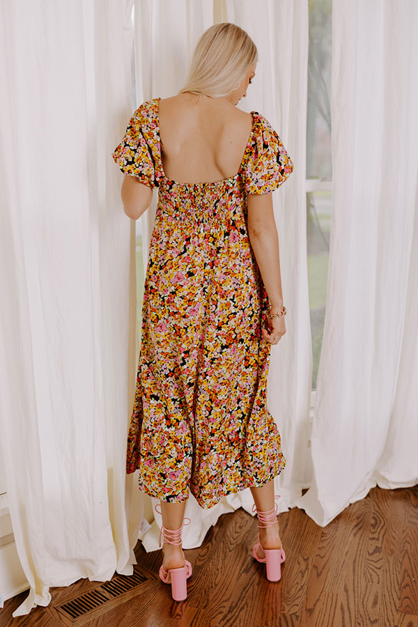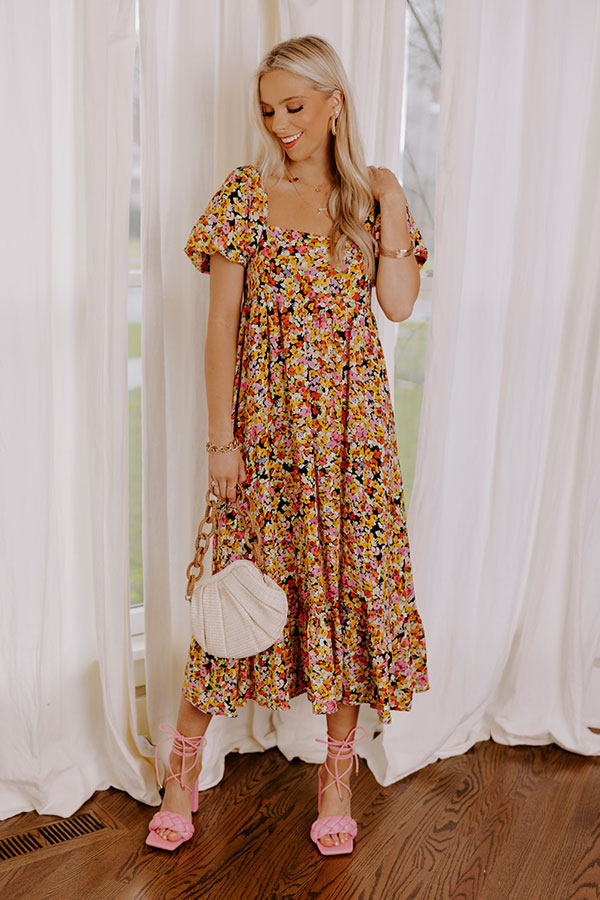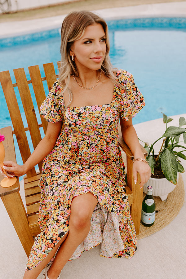 Twirl into style in our pretty black 'Take A Second' midi dress featuring lightweight flowy material patterned with a pink, red/orange, and yellow floral print, a smocked back bodice with a square neckline and upper back, short puff sleeves, and a relaxed skirt silhouette that falls into a straight mid-calf length hemline! on products