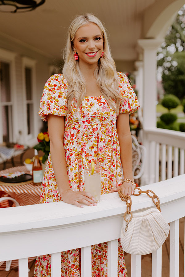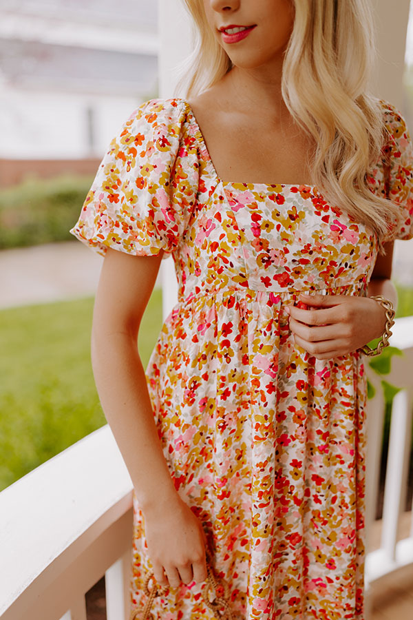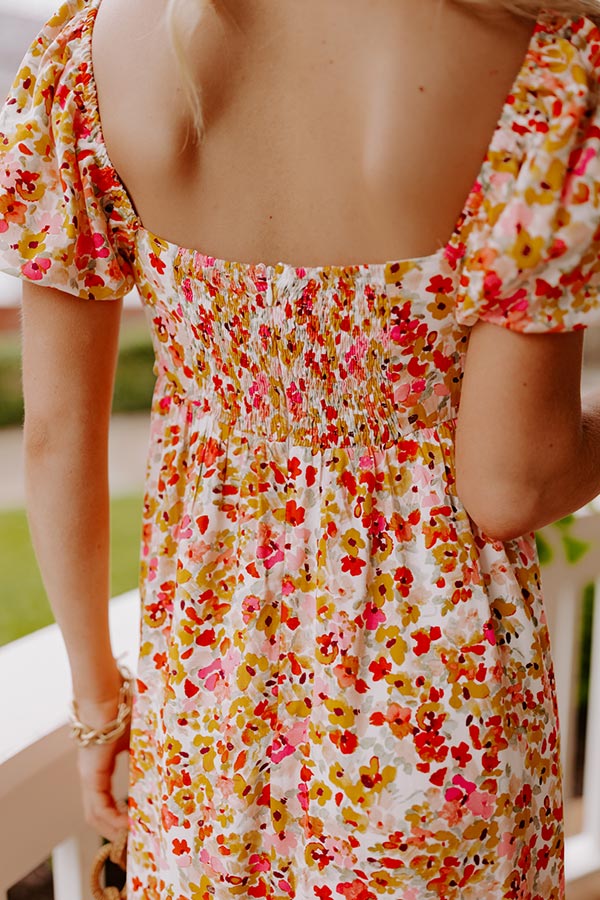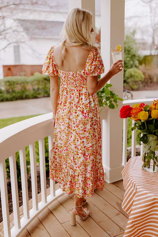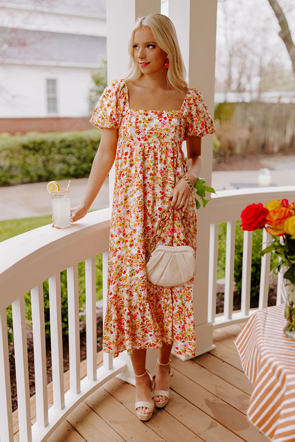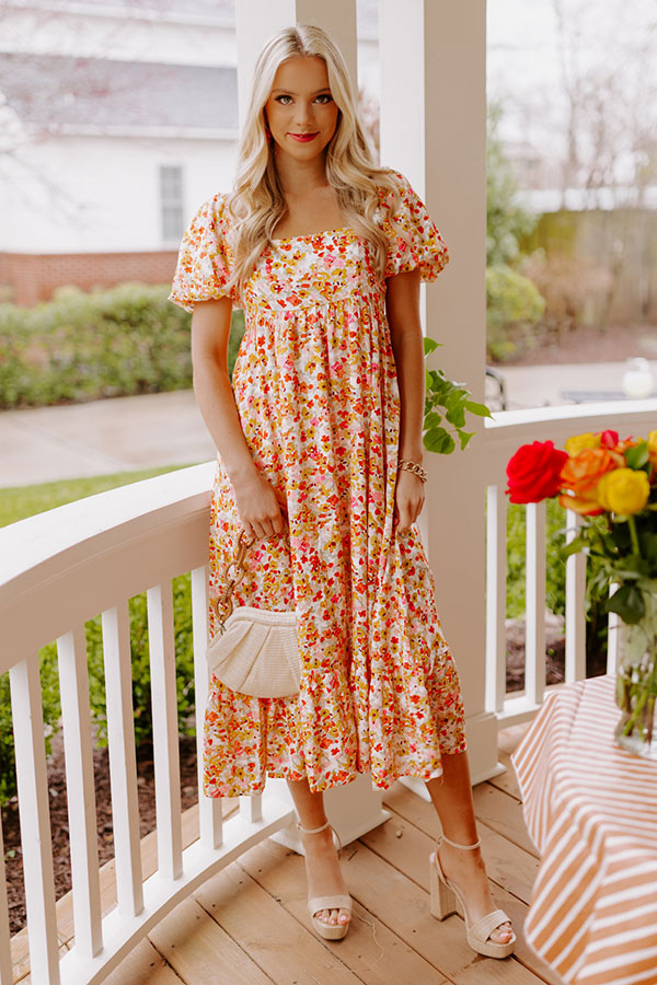 Twirl into style in our pretty ivory colored 'Take A Second' midi dress featuring lightweight flowy material patterned with a pink, red/orange, and yellow floral print, a smocked back bodice with a square neckline and upper back, short puff sleeves, and a relaxed skirt silhouette that falls into a straight mid-calf length hemline! on products Measurements