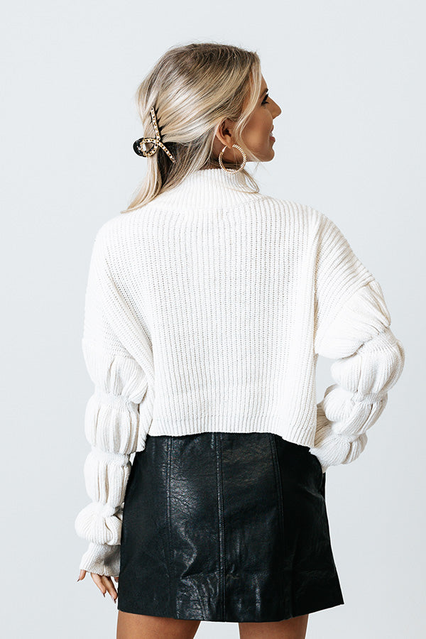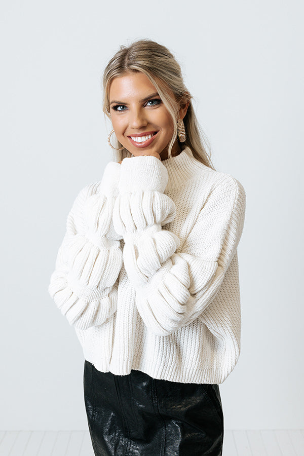 Dress like a true fashionista in our elegant white 'Take A Walk' sweater featuring soft knit material with ribbed detailing, a high neckline, long cinched bubble sleeves with fitted cuffs, and a relaxed but flattering waistline that ends in a straight hemline! Measurements
