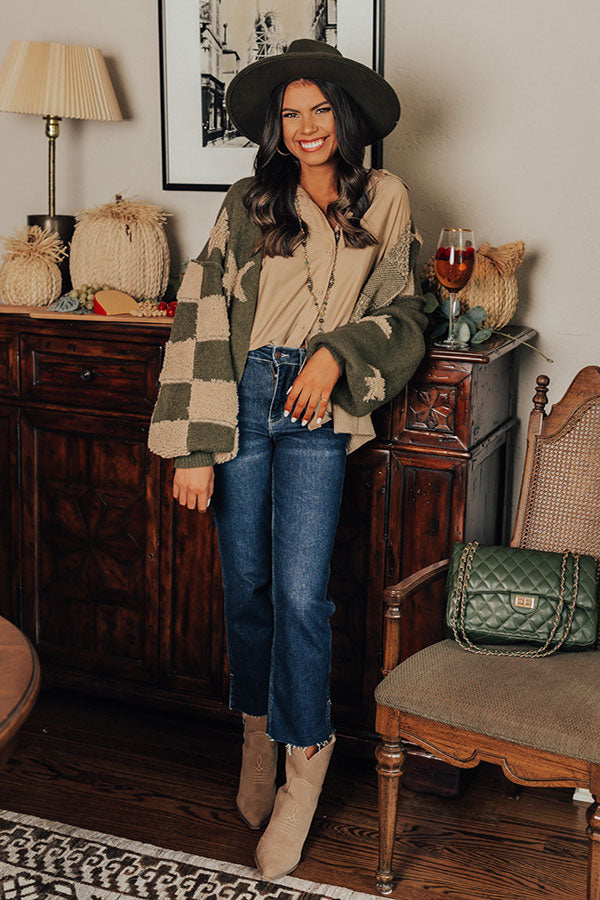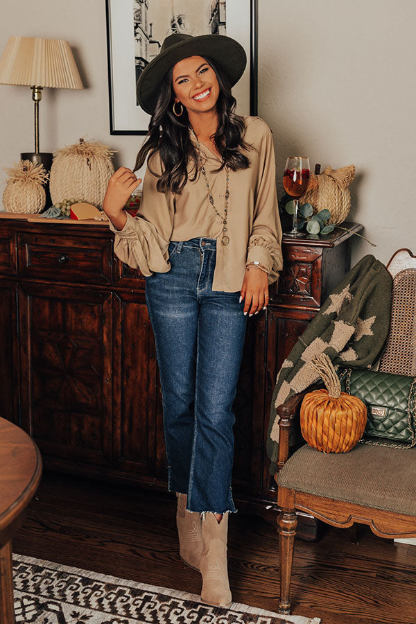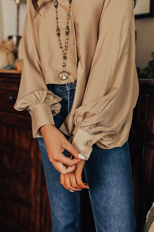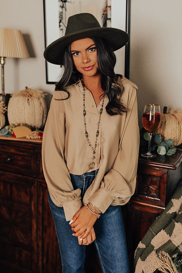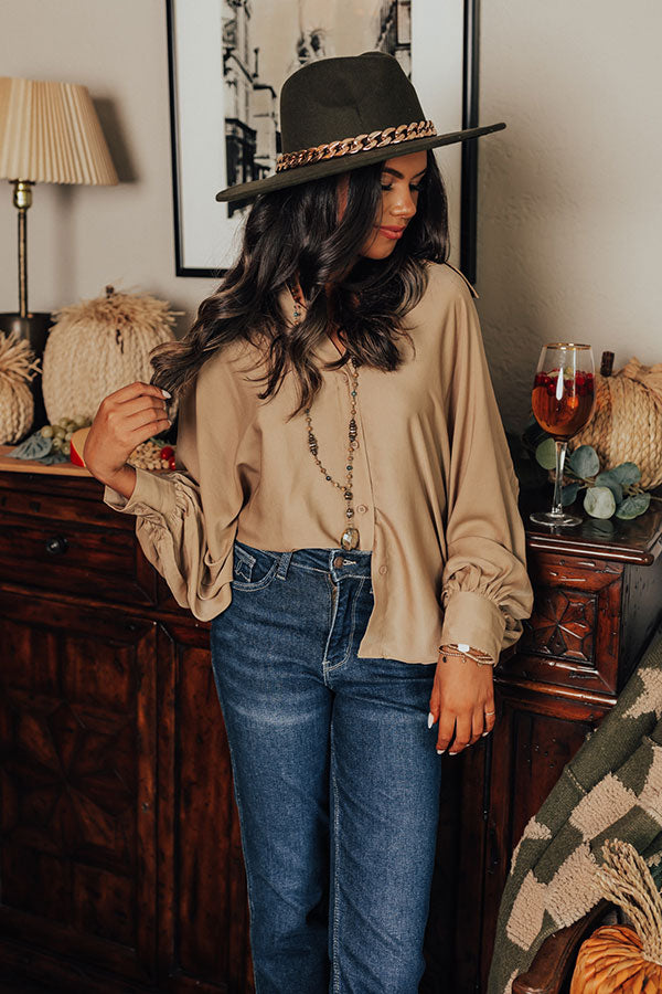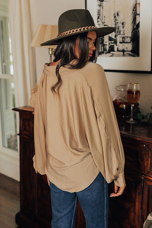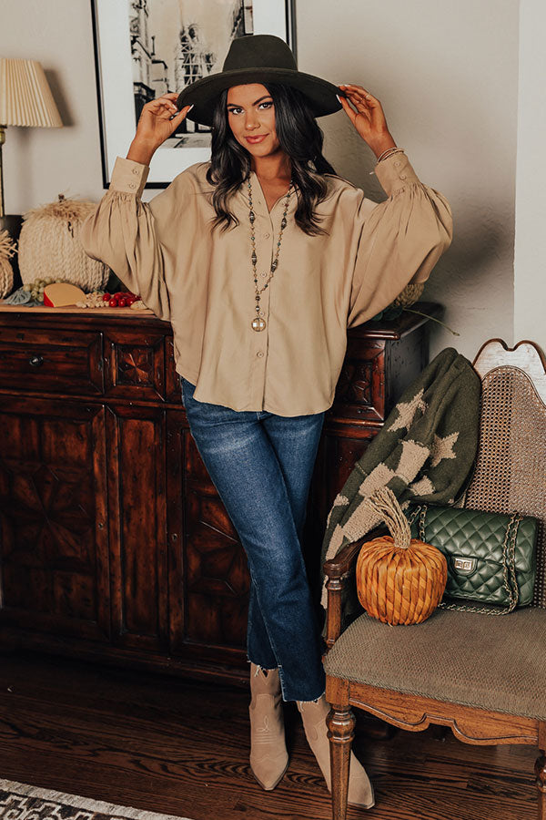 This khaki hued collared button up top features a lightweight material and long dolman sleeves with double button cuff closure.