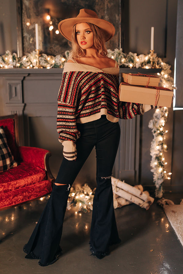 It's the most wonderful time of the year, so give yourself the gift of our adorable "Take Me North Sweater" featuring soft lightweight tight knit material patterned with black, grey, and red horizontal accent stripes, wide trim with ribbed detailing, long loose sleeves, a v-cut neckline that can be worn off one shoulder, and a relaxed silhouette that falls into a straight hemline! This piece styles perfectly with some distressed black flares and a neutral faux suede hat, but you can also wear it with some distressed ankle skinnies, our "Keaton Faux Suede Ankle Bootie," and our "Going, Going, Glam Faux Leather Tote in Taupe!" Measurements