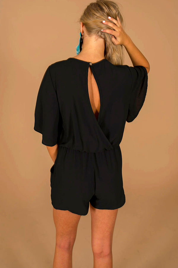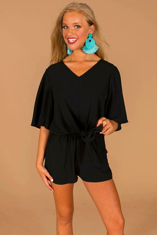 TIE down some plans, this must-have romper is ready to have a good time! This romper has a v-cut neckline, a short sleeved tie-front bodice that rests a top a cinched elastic waist, a surplice keyhole back & a breezy polyester short with side pockets. Just add heels & a colorful statement earring, & let the good times roll!