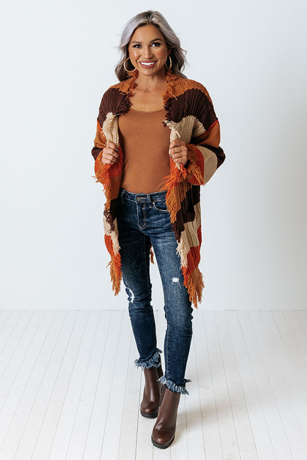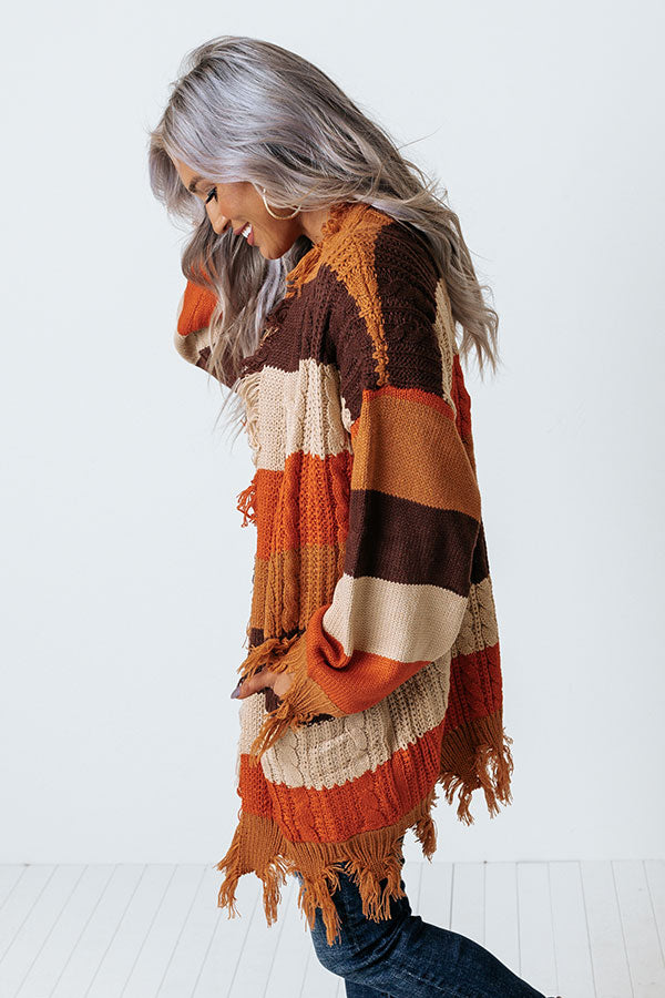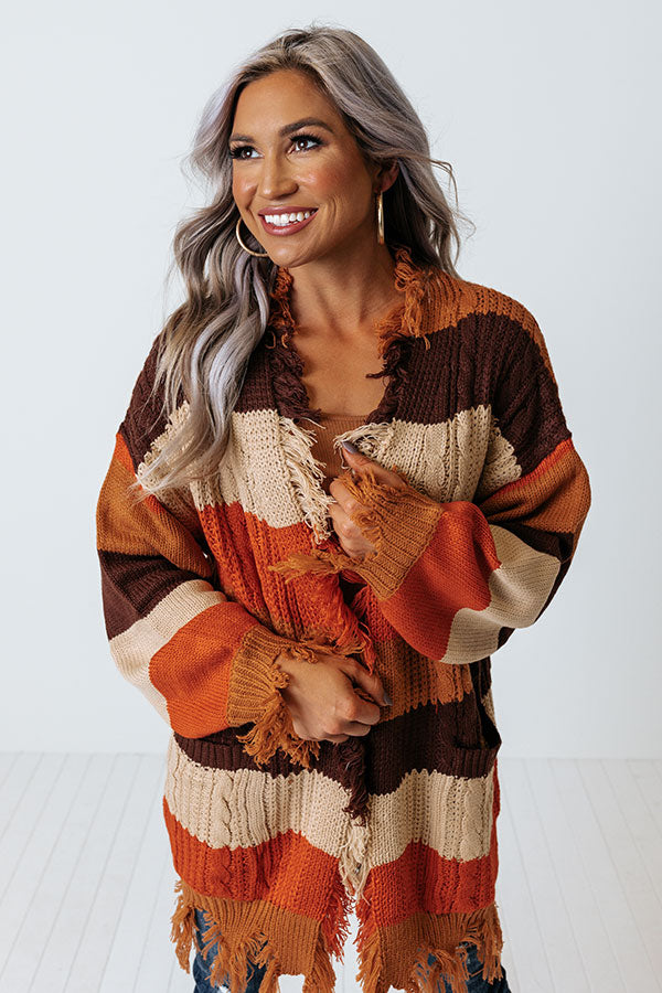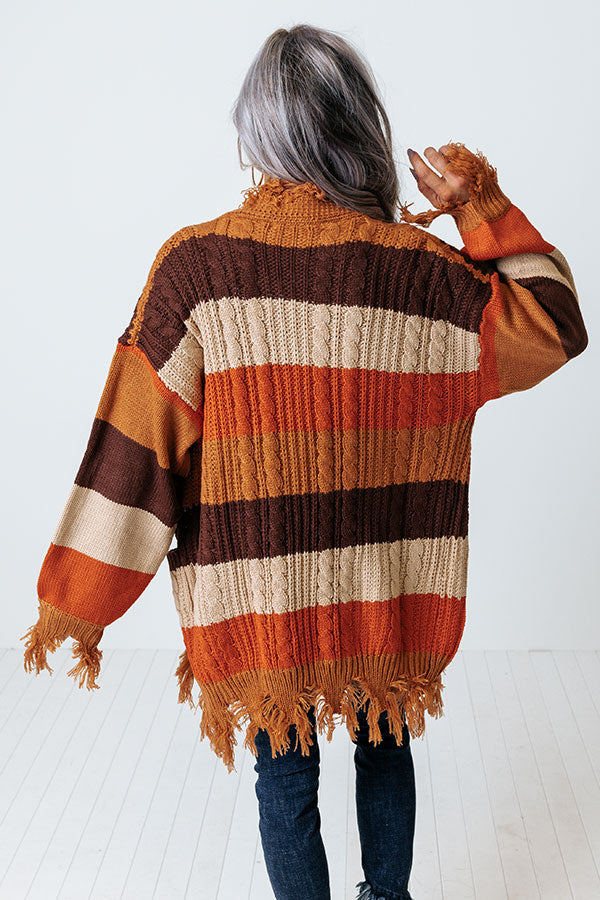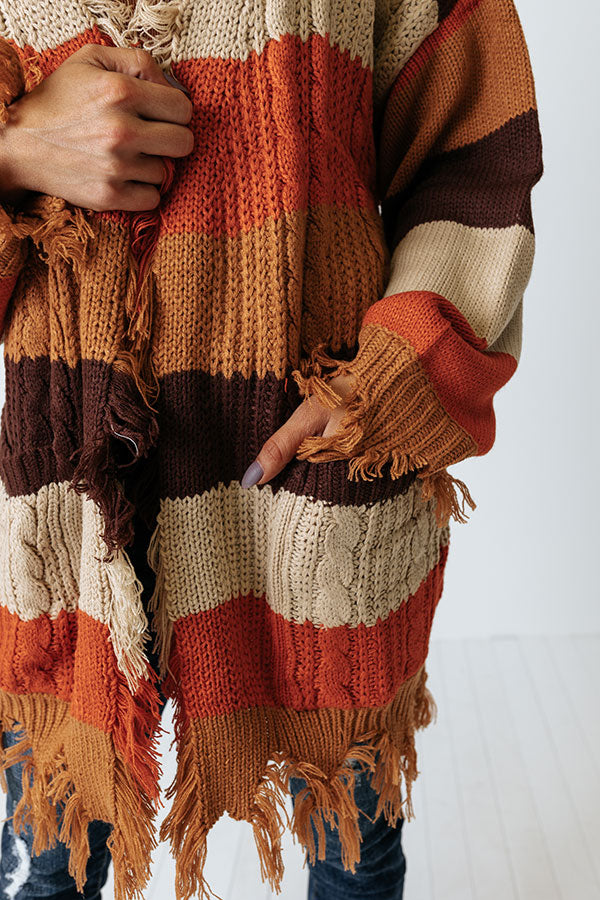 Make the transition into fall effortless with our pretty 'Take My Place' cardigan featuring thick and warm cable knit material with wine, rust, and birch hued accent stripes, long oversized sleeves, low pockets, ultra fringe trim detailing, and a draped open front silhouette that falls into a straight mid-thigh length hemline! Measurements