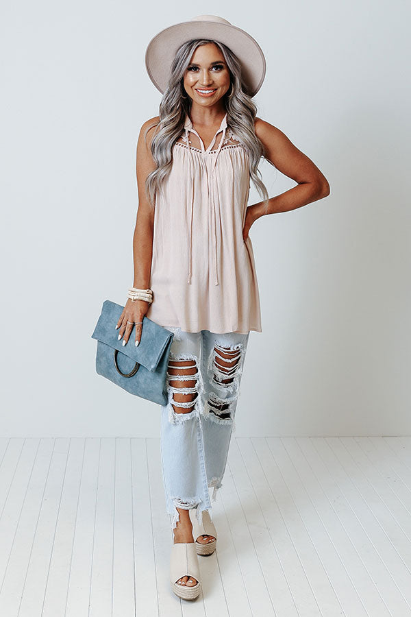 Take on the world in style with this pretty light pink shift top featuring lightweight flowy material with intricate lace detailing around the shoulders and upper back, a v-cut neckline with a tie closure, and a relaxed silhouette that falls into a rounded hemline!