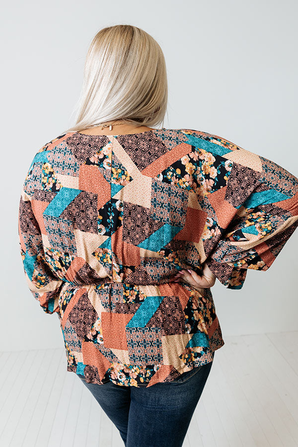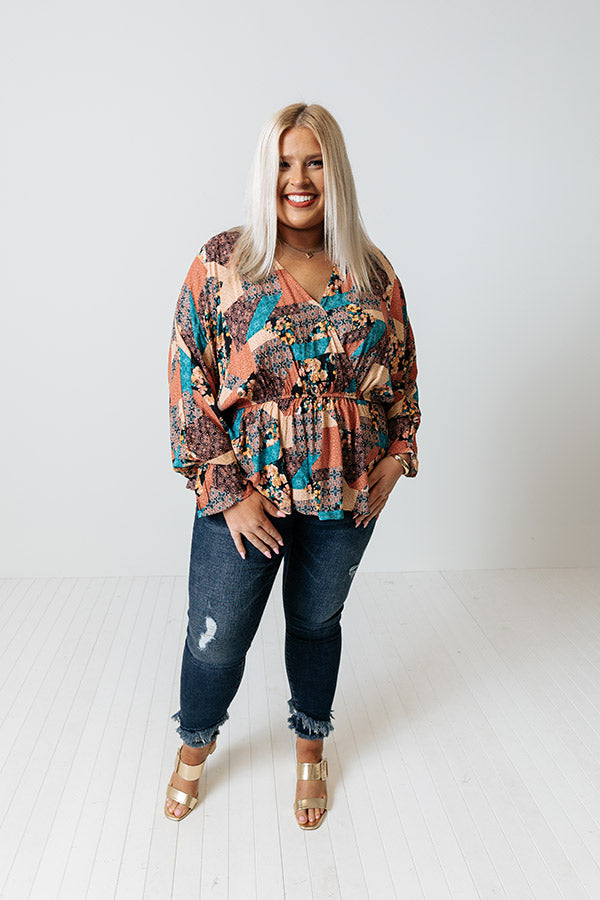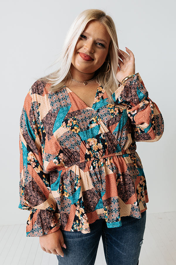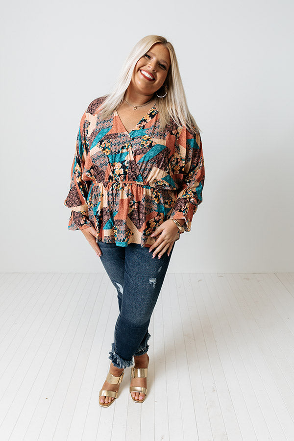Take on the world in style with this eye-catching plus size top featuring lightweight material patterned with unique rust and teal hued patchwork patterns, long bishop sleeves with flared cuffs, a faux wrap bodice with a v-cut neckline, a cinched waistline, and a relaxed silhouette that ends in a straight peplum hemline!
