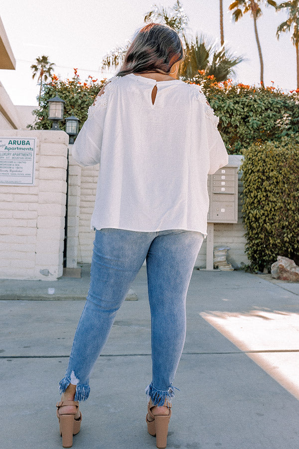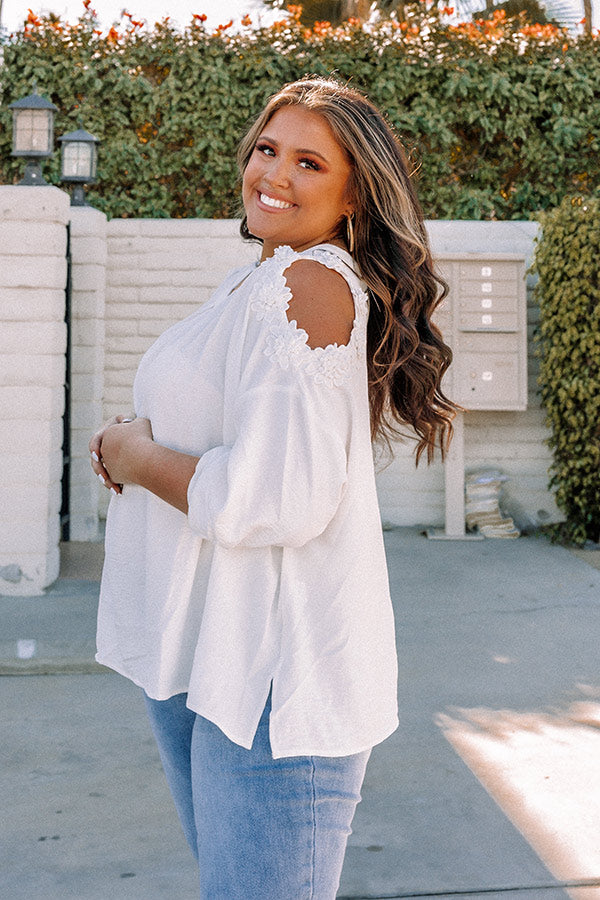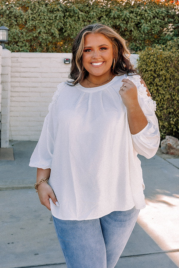 Slay all day in our darling white plus size 'Take The Coast Shift Top' featuring lightweight material, a rounded neckline, loose 3/4-length sleeves with lace trim shoulder cutouts, a keyhole accented upper back with a button closure, and a relaxed silhouette that falls into a straight hemline!