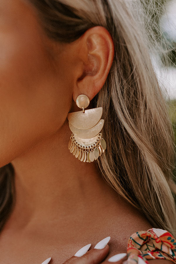 These earrings take the crown for our new fave statement earrings! They feature flat gold circle studs and dangling flat gold overlapping half circles with an accent tassel fan on the bottom one!