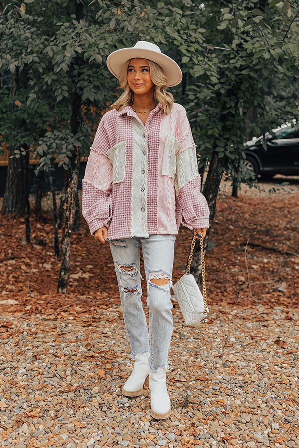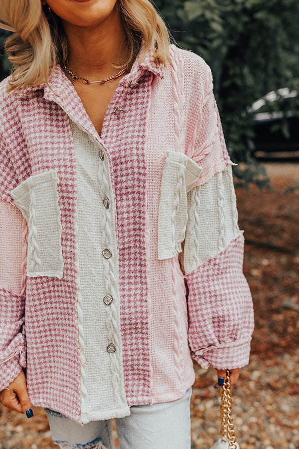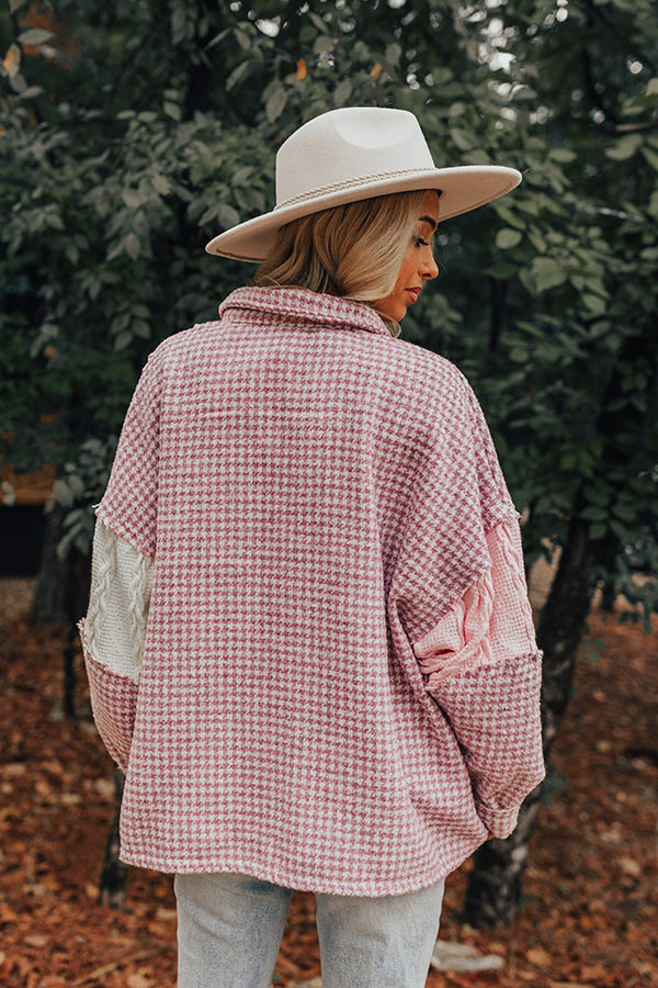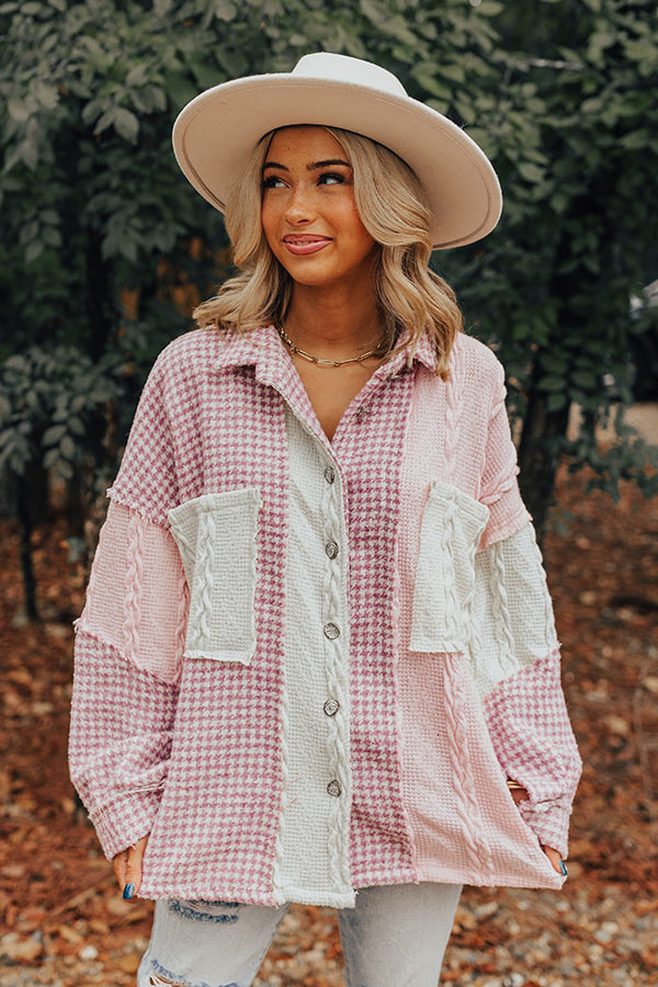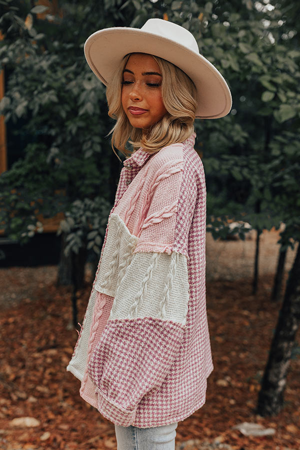 - Unlined knit material in pink and white hues as well as black and white houndstooth patterned material in a color block design