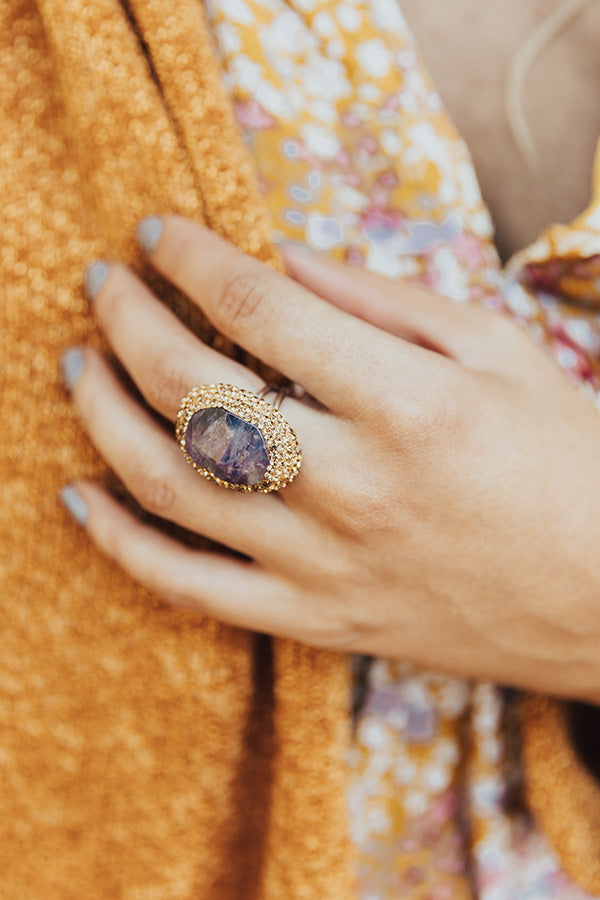 Complete your look beautifully with our gorgeous 'Take You Far' ring featuring a large dark purple semi precious stone surrounded by a shimmering gold setting! Due to the natural stone there may be some variations in color, shape, and size.