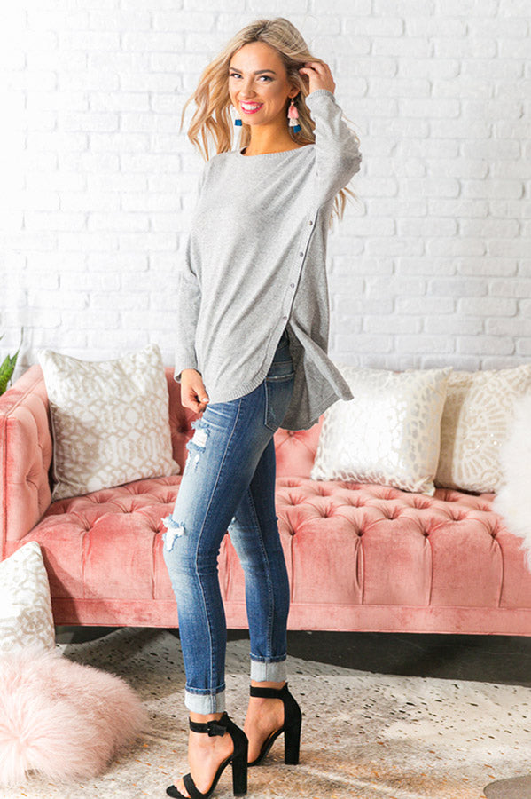 Cozy up in the prettiest tunic sweater this season! We are loving the subtle high low cut and button detailing on this one. Pair it back with some jeans and booties and this will be your favorite look this season! It's lightweight and easy to wear, you'll want it in every color!