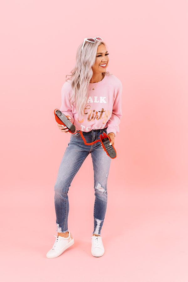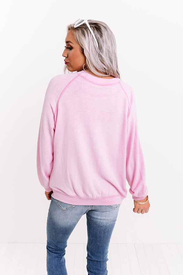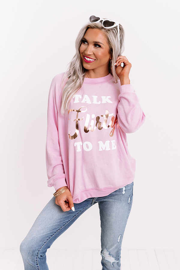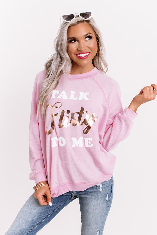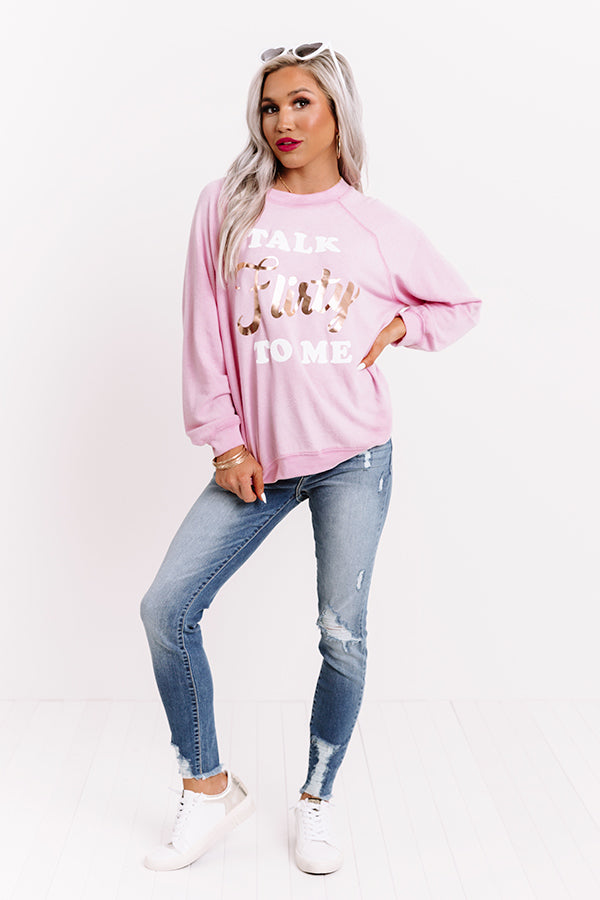 Keep date night casual with this flirty pink sweatshirt featuring soft lightweight material with white and gold lettering on the front, a high rounded neckline, long loose sleeves with fitted cuffs, and a slouched silhouette that ends in a straight hemline! Measurements