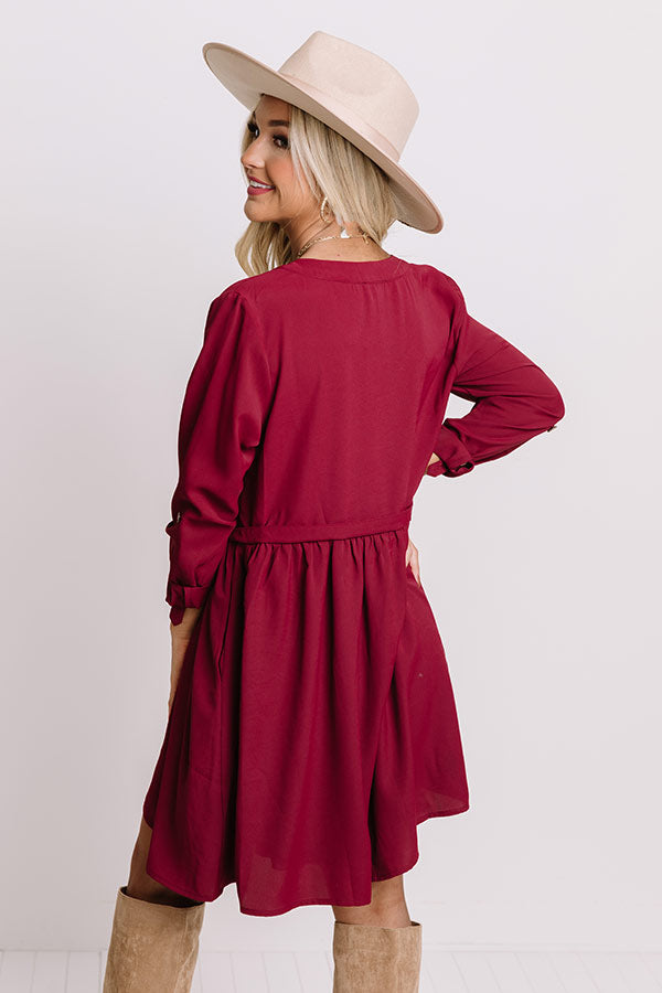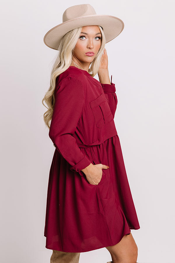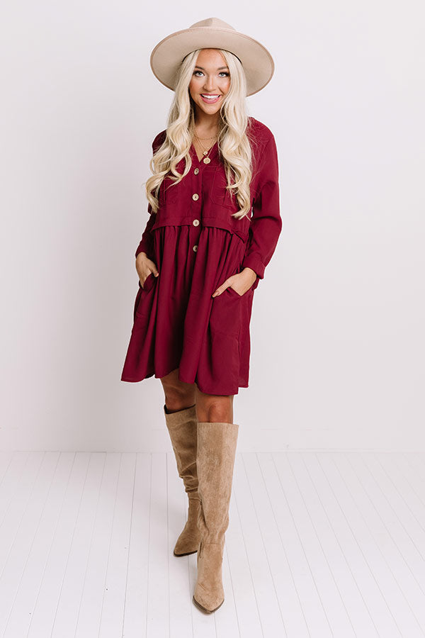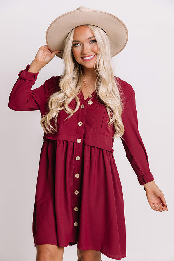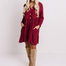 We have no doubt you will be the "talk of the town" when you wear this charming wine colored shift dress featuring lightweight flowy material, a button down front with a v-cut neckline, loose long sleeves with roll-tab cuffs, two accent chest pockets and two hidden side pockets, and a relaxed silhouette that cascades in to a rounded mid-thigh length hemline! Measurements