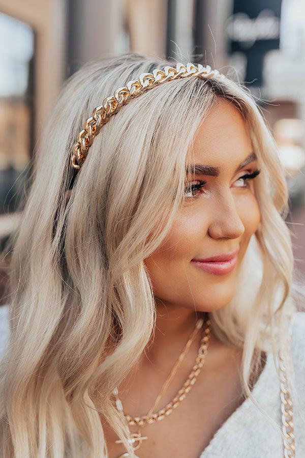 Make a luxurious statement with our stunning 'Talk Of Tinseltown Headband' featuring a thick gold chain on a structured band!