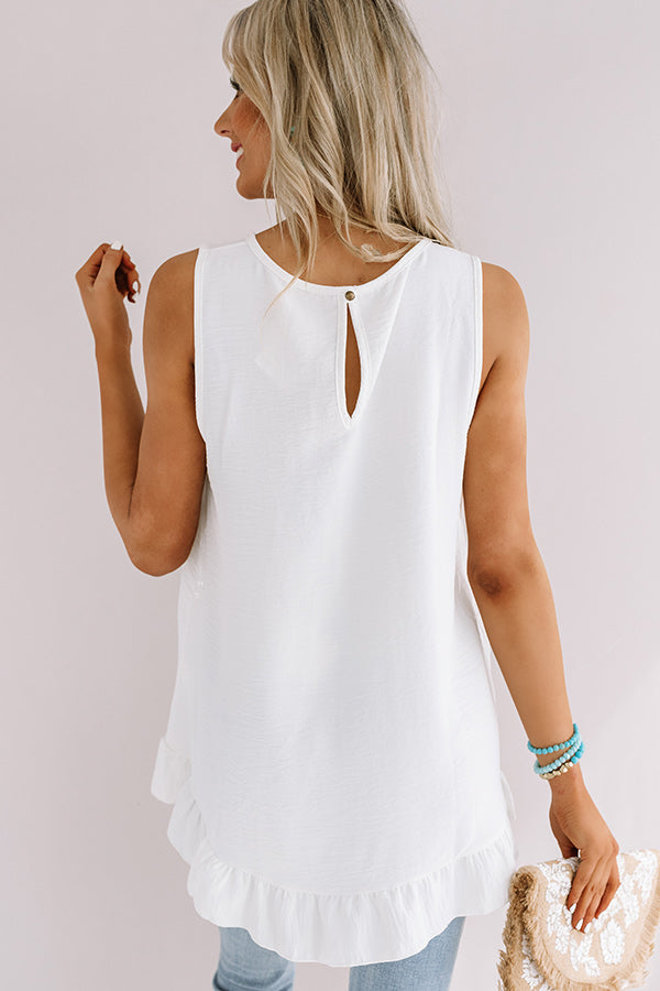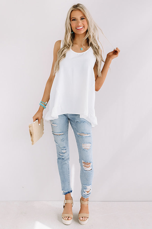 You are sure to be the "talk of Tulum" when you wear this adorable white shift top featuring lightweight breezy material, a scooped neckline, wide 3-inch shoulder straps, a keyhole accented upper back with a button closure, and an ultra relaxed silhouette that falls into an uneven ruffled hemline! We have styled this chic piece with solo some distressed ankle skinnies, neutral wedges, and an embellished clutch, but you can also wear it layered under a grey knit cardigan with some frayed black shorts, "The Tory Snake Print Heel," and a matching snake print hair scarf! Measurements