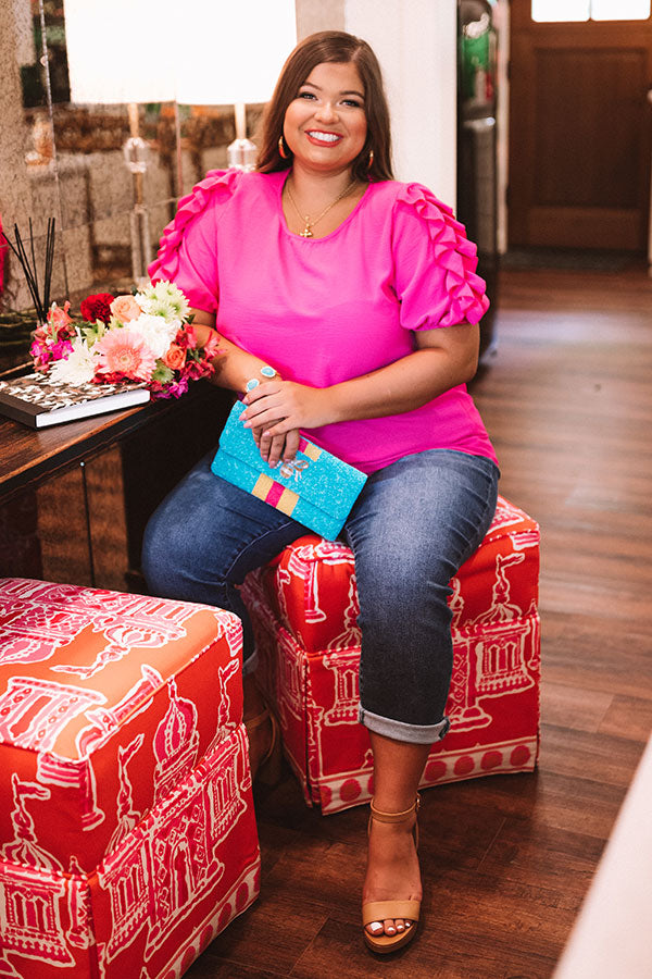 Plus Size - Live life to the fullest in our vibrant hot pink "Talkin' About Tulum Shift Top" featuring lightweight breezy material, a high rounded neckline, loose short sleeves with fitted elastic band cuffs and oversized ruffle detailing, and a relaxed silhouette that falls into a straight hemline! You can style this eye-catching piece a variety of ways, like with some dark wash jeans, neutral heels, and a matching beaded clutch, but you can also wear it with some frayed white shorts, "The Cameron Espadrille in Hot Pink," and our "Tour De Chic Gingham Hat in Pink!" Measurements