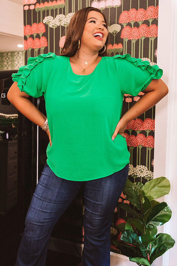 Plus Size - Live life to the fullest in our vibrant kelly green "Talkin' About Tulum Shift Top" featuring lightweight breezy material, a high rounded neckline, loose short sleeves with fitted elastic band cuffs and oversized ruffle detailing, and a relaxed silhouette that falls into a straight hemline! You can style this eye-catching piece a variety of ways, like with some dark wash flares, neutral wedges, and a brown tote, but you can also wear it with some frayed white shorts, sunnies, and "The Nixie Lace Up Heel in Green!" Measurements