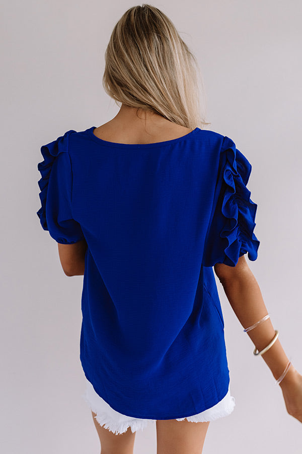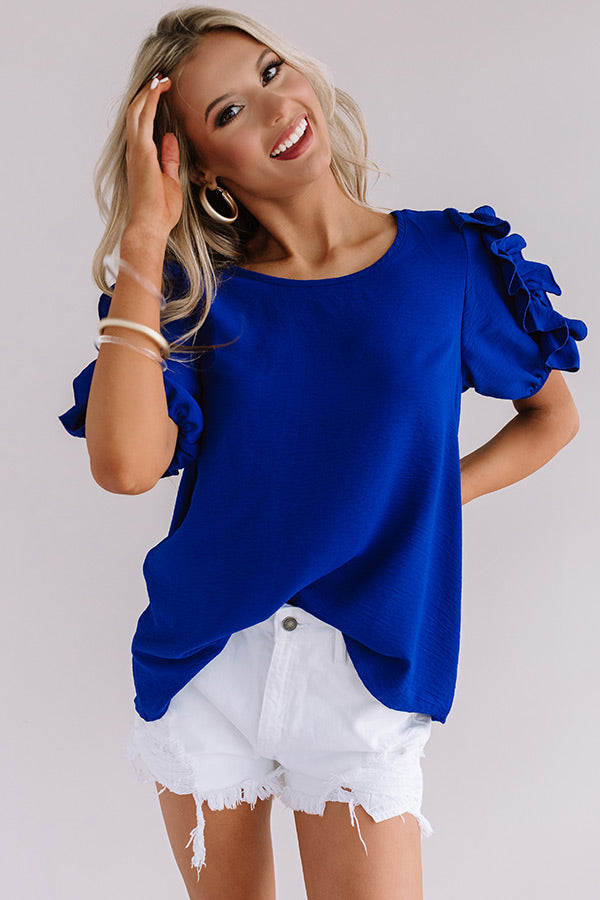 Live life to the fullest in our vibrant royal blue "Talkin' About Tulum Shift Top" featuring lightweight breezy material, a high rounded neckline, loose short sleeves with fitted elastic band cuffs and oversized ruffle detailing, and a relaxed silhouette that falls into a straight hemline! You can style this eye-catching piece a variety of ways, like with some distressed jeans and a black heel and tote, but you can also wear it with some frayed white shorts, "The Cameron Espadrille in Hot Pink," and our "Tour De Chic Gingham Hat in Pink!" Measurements