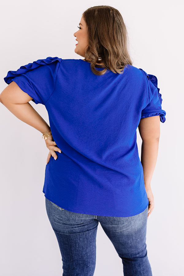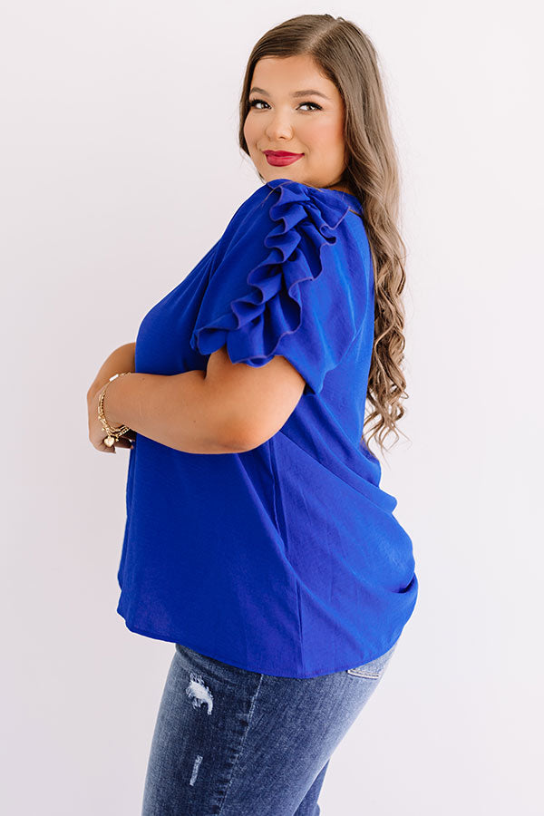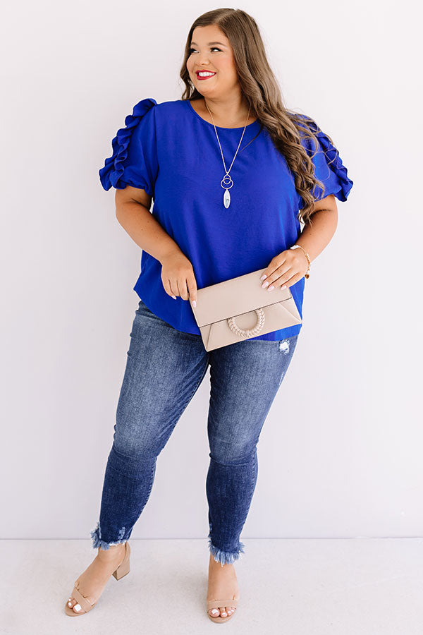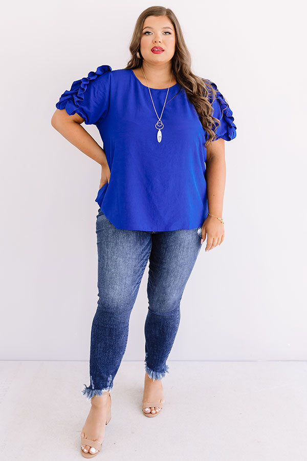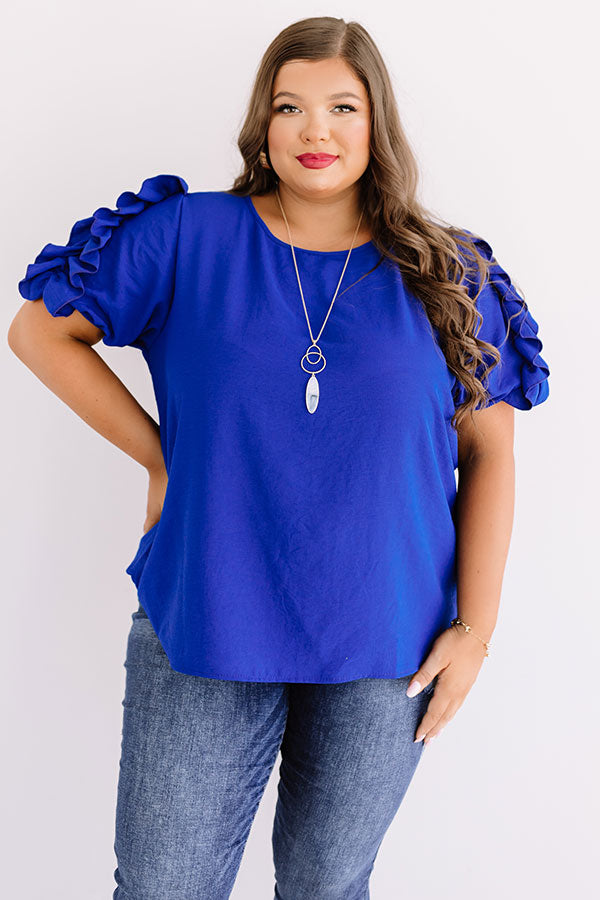 Plus Size - Live life to the fullest in our vibrant royal blue "Talkin' About Tulum Shift Top" featuring lightweight breezy material, a high rounded neckline, loose short sleeves with fitted elastic band cuffs and oversized ruffle detailing, and a relaxed silhouette that falls into a straight hemline! You can style this eye-catching piece a variety of ways, like with some distressed jeans and a neutral heel and clutch, but you can also wear it with some white flares, "The Jess Faux Leather Heel in Grey," and our matching "Style Session Headband in Grey!" Measurements