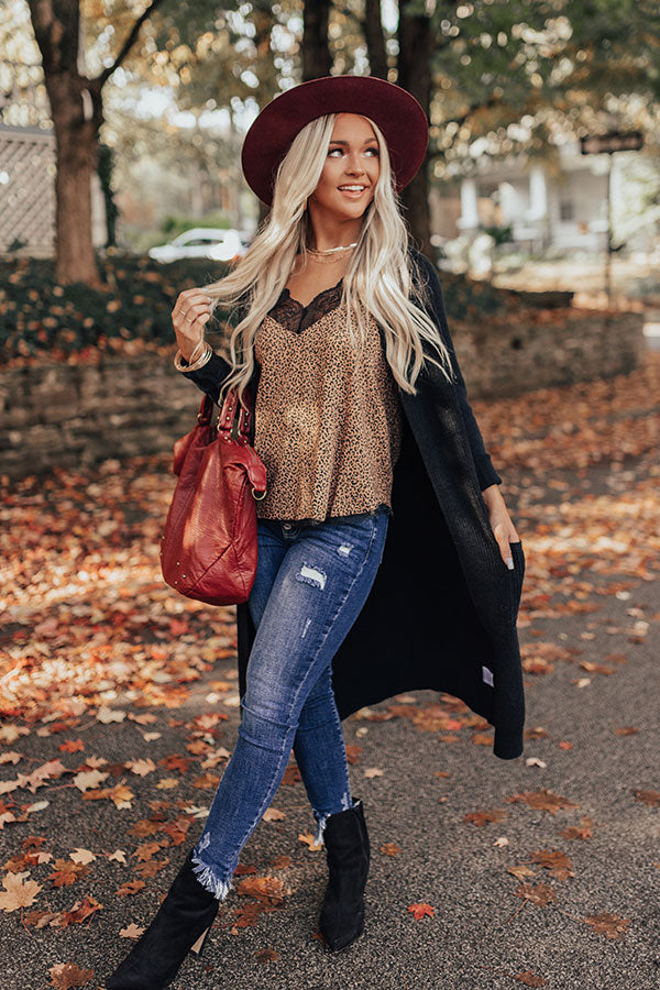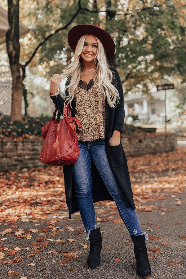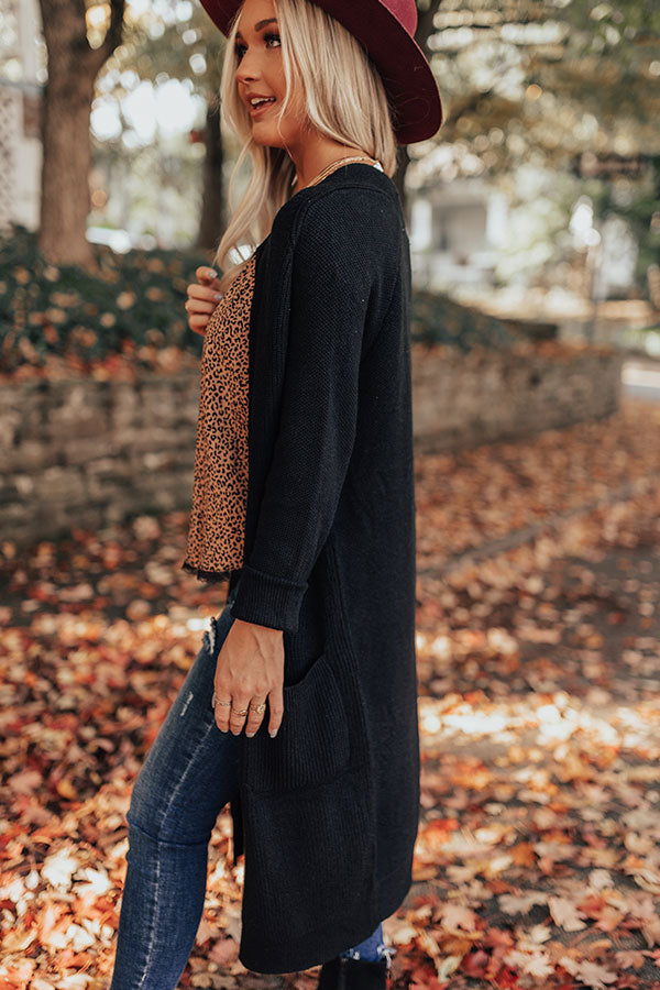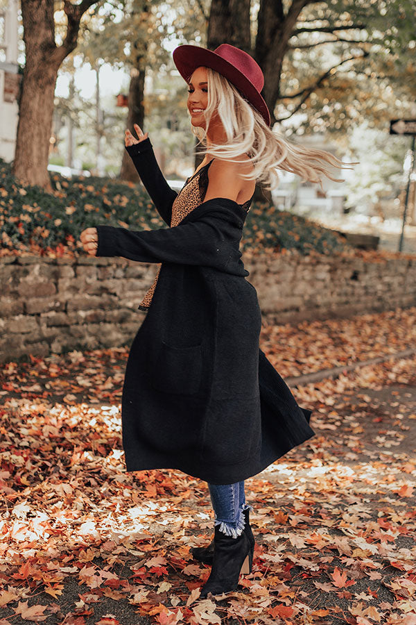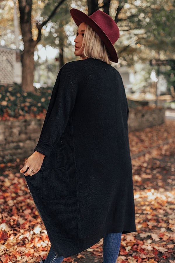 It's no tall tale that the perfect fall cardigan just dropped! This black beauty features soft lightweight tight knit material with subtle vertical ribbed texturing, long loose sleeves, low accent side pockets, and an ultra draped open front silhouette that cascades into a straight mid-calf length hemline! Measurements