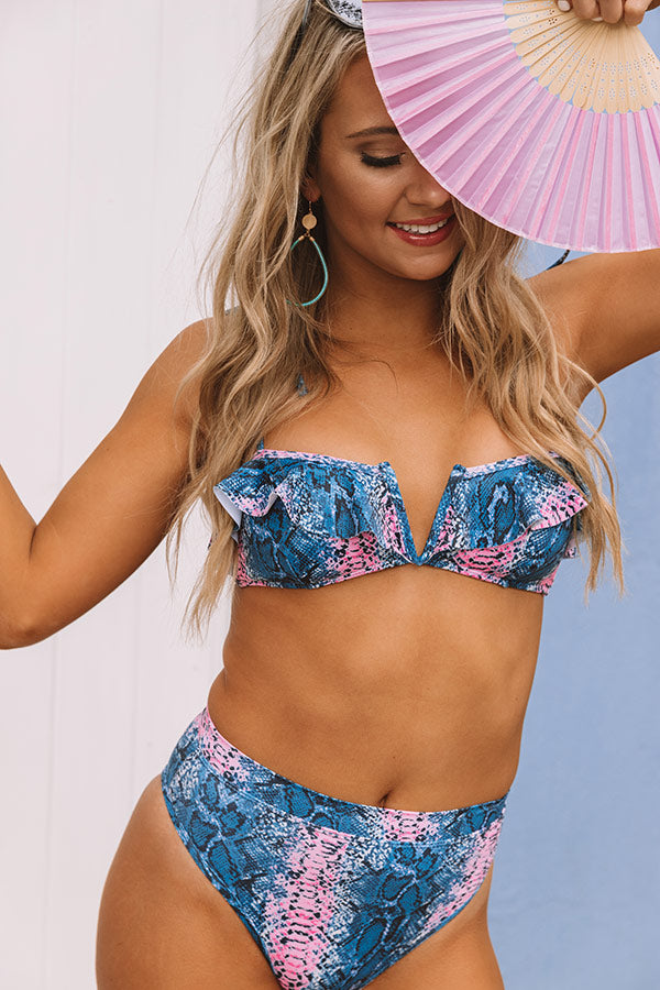 Life is better in a bikini, so add our "Tans And Tikis" bikini top to your cart with its stretchy polyester material patterned with a blue and pink snake print, a straight neckline with a v-notched accent and ruffled trim detailing, tied spaghetti shoulder straps, and an elastic waistband with a hook closure! This piece styles perfectly with our "Tans And Tikis High Waist Cheeky Bikini Bottom in Snake Print," a cover up, sunnies, and a straw hat and tote for the ultimate two-piece swim set!