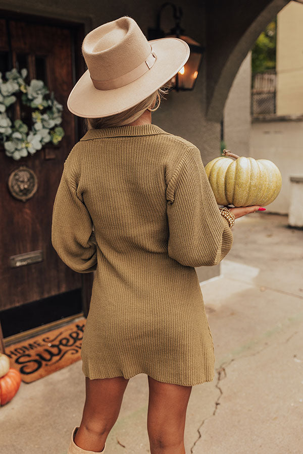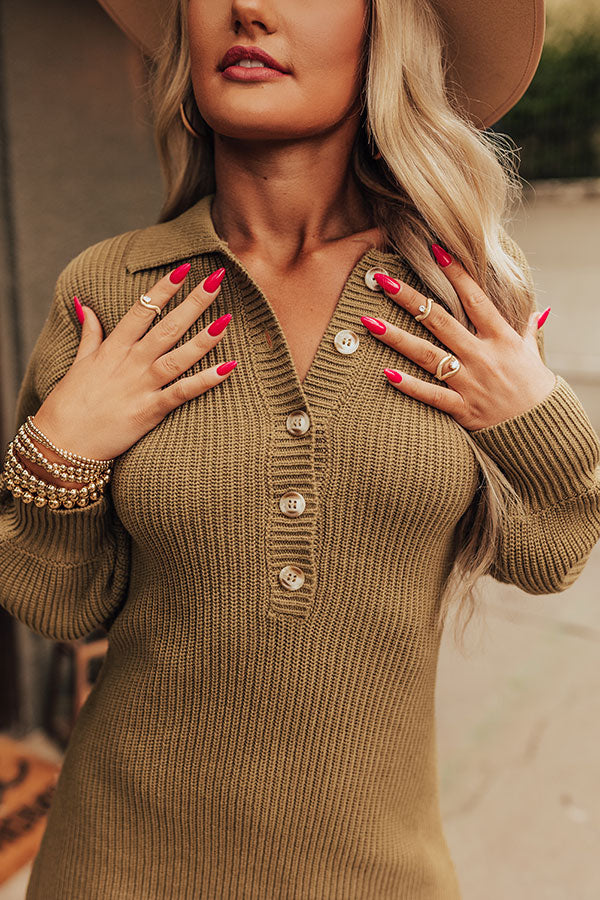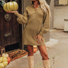 Get dressed to impress in our cute martini olive colored 'Tavern Nights' dress featuring soft and warm knit material with subtle vertical ribbed texturing, a button up bodice with a collared neckline, long loose sleeves with fitted cuffs, and a relaxed but flattering silhouette that falls into a straight mid-thigh length hemline!