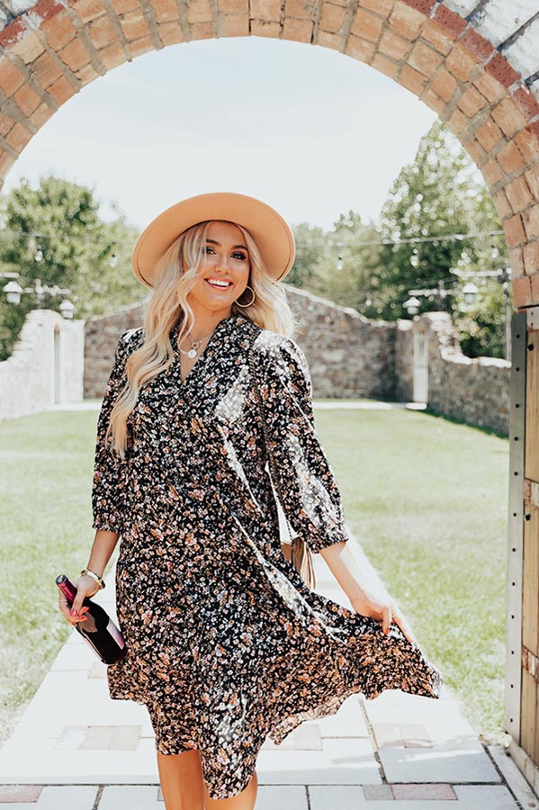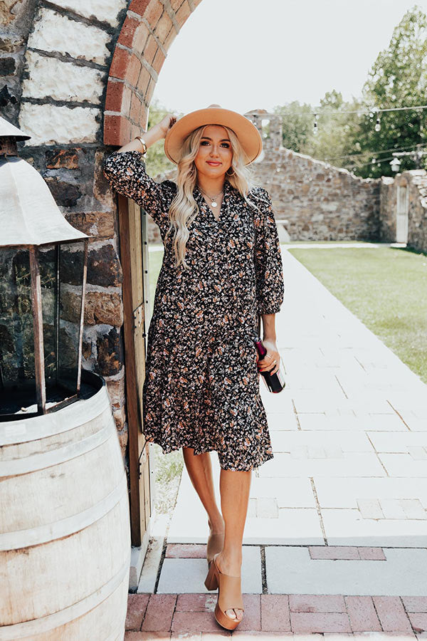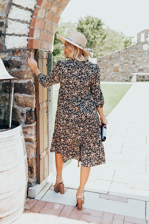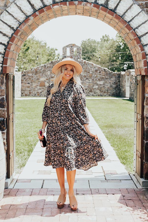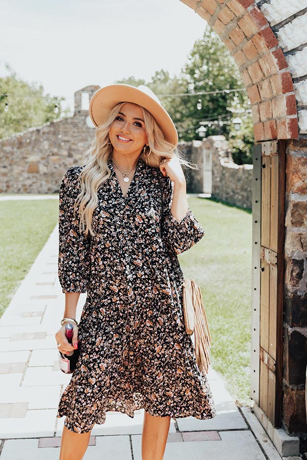Dress to impress this fall in our darling black 'Tea And Crumpets' midi dress featuring lightweight flowy material patterned with a rust hued floral print, a v-cut neckline, loose 3/4-length sleeves, hidden side pockets, and a relaxed tiered silhouette that cascades into an uneven mid-calf length hemline! Measurements