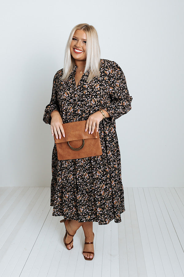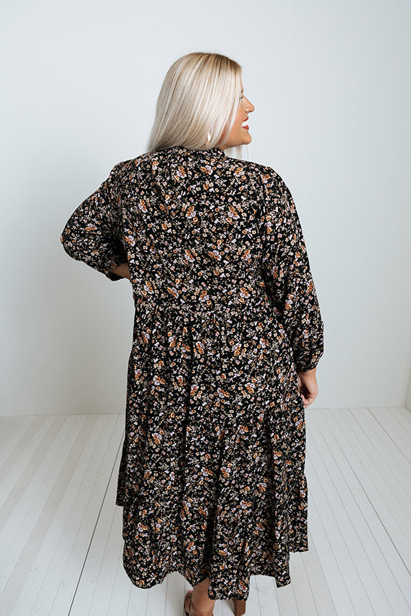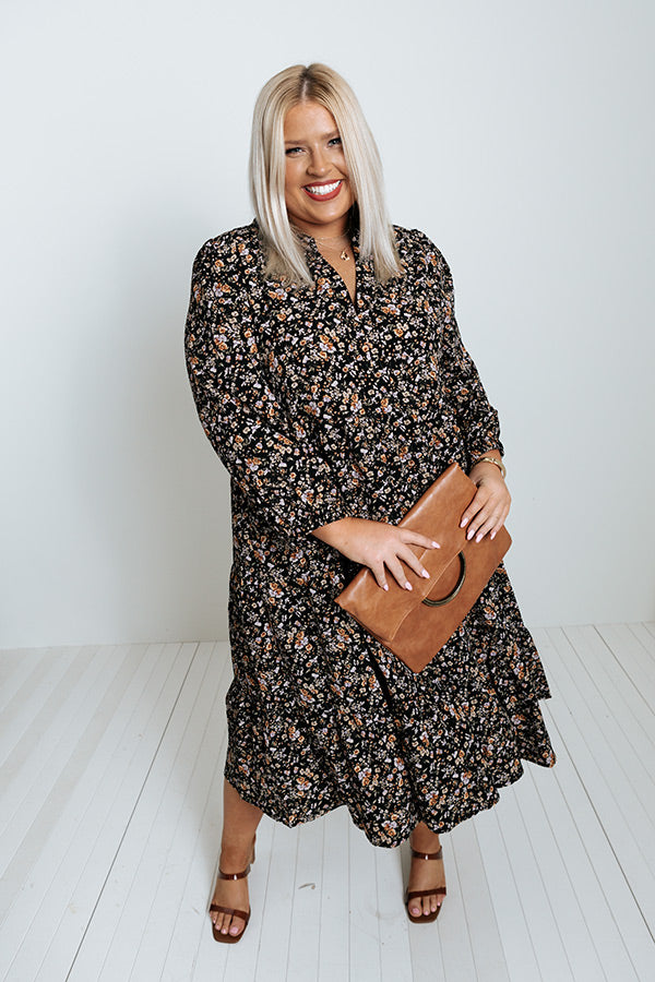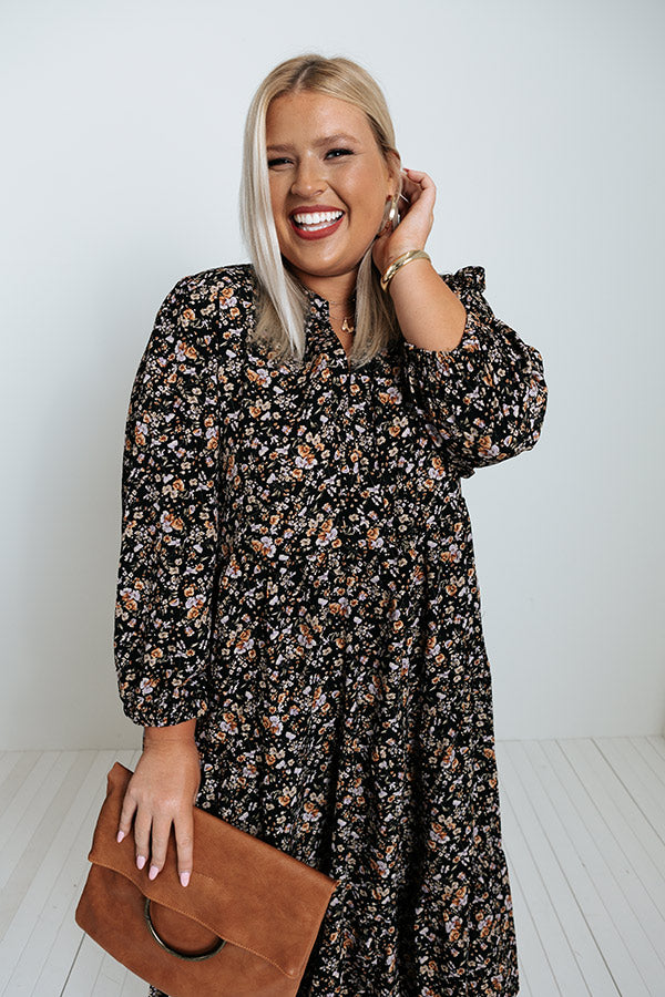 Plus Size - - Dress to impress this fall in our darling black 'Tea And Crumpets' midi dress featuring lightweight flowy material patterned with a rust hued floral print, a v-cut neckline, loose 3/4-length sleeves, hidden side pockets, and a relaxed tiered silhouette that cascades into an uneven mid-calf length hemline! Measurements