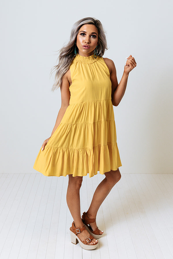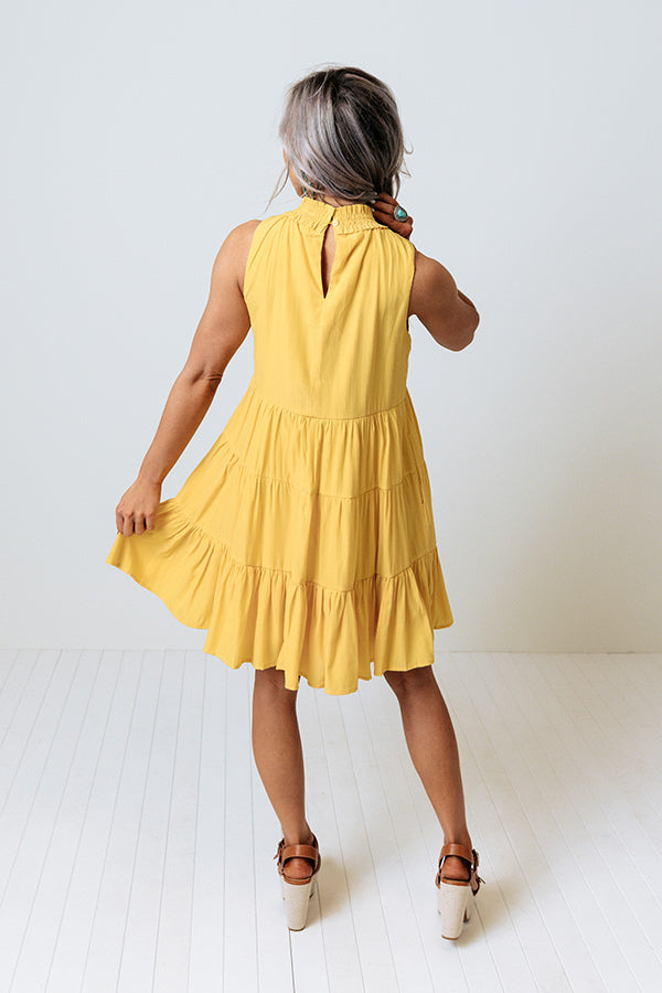 Arrive in style with our darling primrose yellow 'Tea And Tunes Shift Dress' featuring lightweight flowy material with pleated texturing, a smocked collar neckline, a sleeveless bodice, a keyhole accented upper back with a button closure, and an ultra relaxed but flattering tiered silhouette that cascades into an uneven mid-thigh length hemline! Measurements