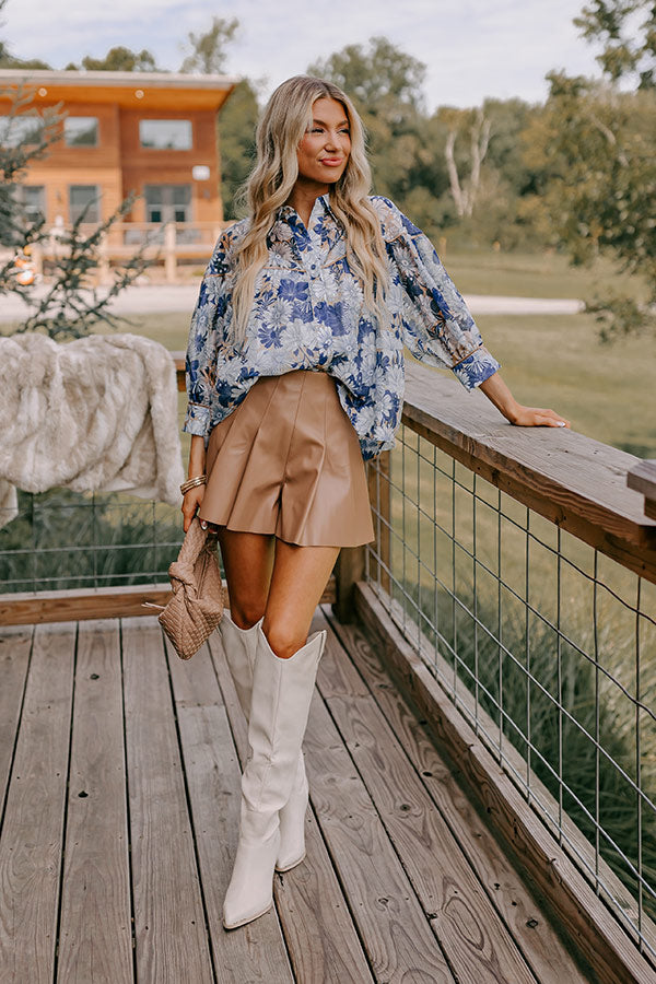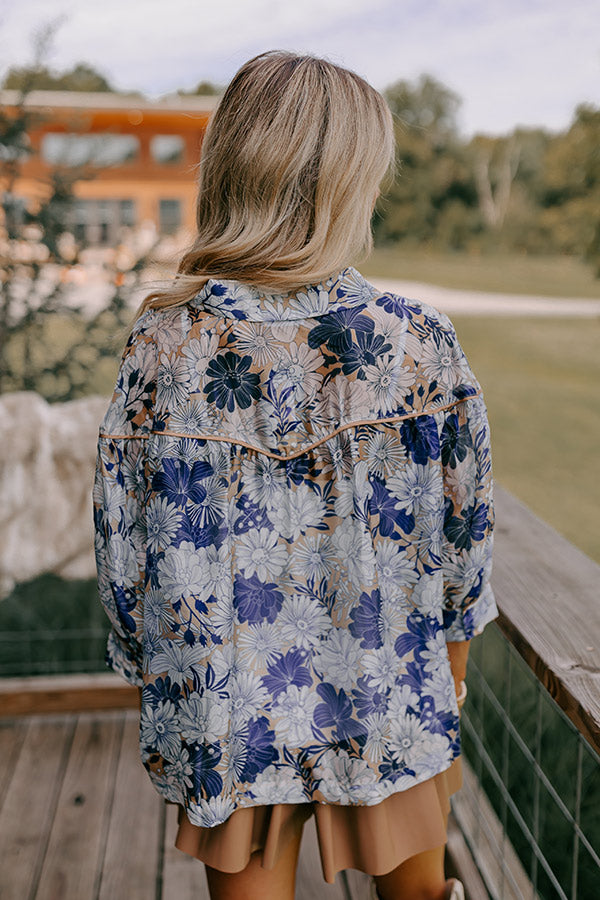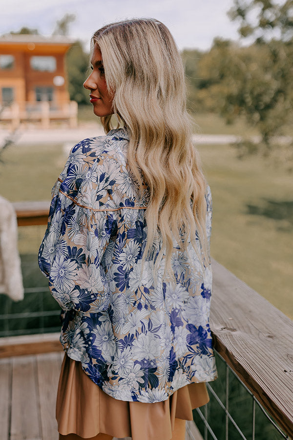 - Channel flower power vibes with this adorable top! Featuring airy floral fabric and a playful collared neckline, this flowy beauty brings a touch of whimsy to your OOTD. Slip it on and feel effortlessly fabulous, no matter where your day takes you! - Sheer organza material with a white, sapphire, and gold colored floral print - A collared neckline - A button up neckline - Gold colored accent trim with a satin finish on the yoke and sleeve cuffs - ¾ length sleeves with button closure cuffs - A separate ash white colored camisole with a v-cut neckline and adjustable straps
