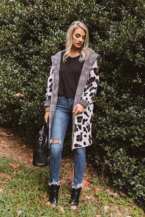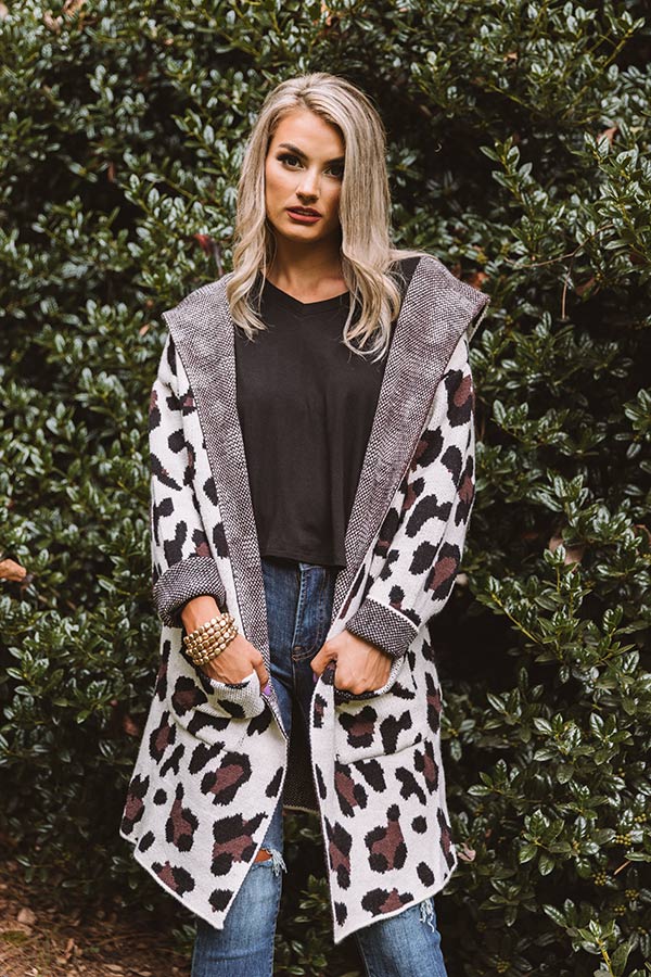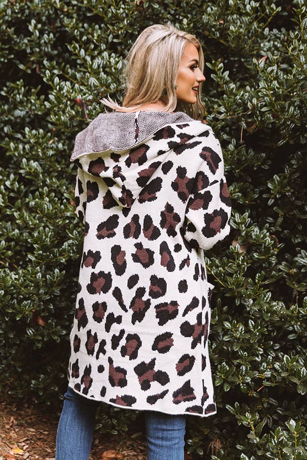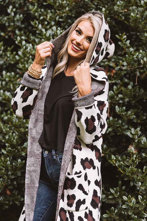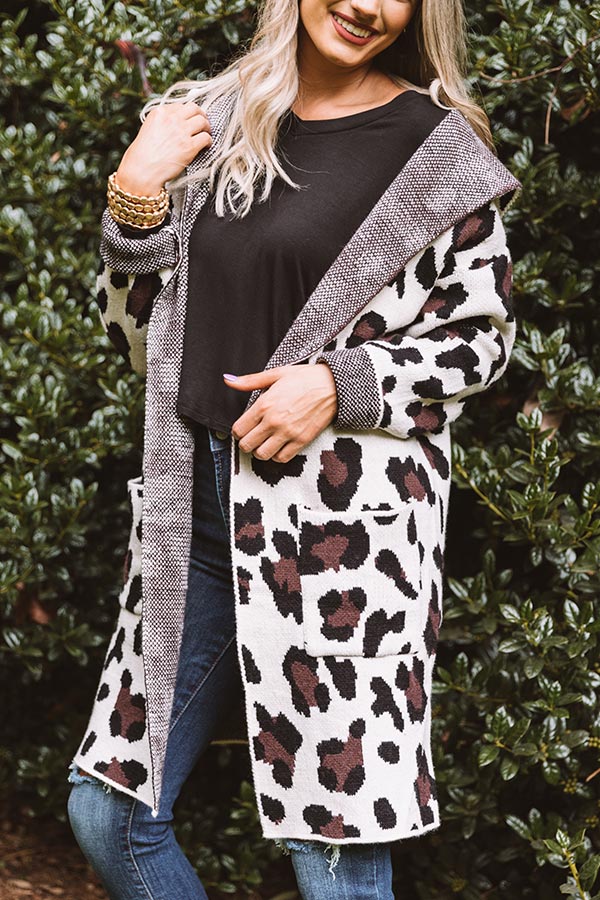 Cozy up for an afternoon autumn "tea time" in this warm white cardigan featuring ultra soft thick tight knit material patterned with a large brown and black leopard print, long loose sleeves with cuffs that can be rolled, a hooded back, low accent side pockets, and a relaxed open front silhouette that falls into a straight mid-thigh length hemline! Measurements