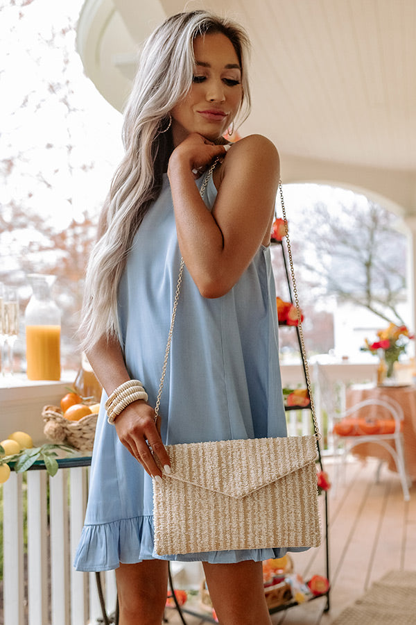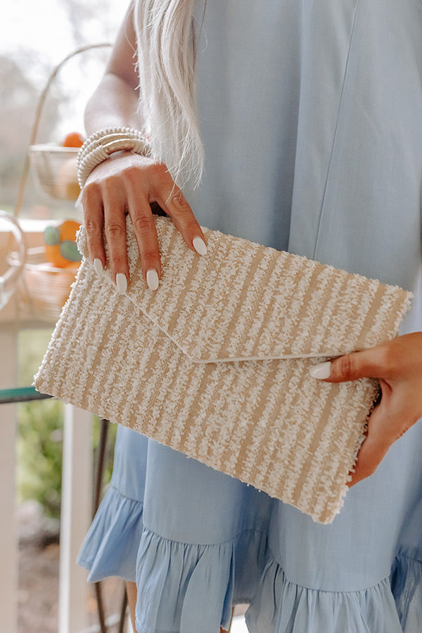 The perfect spring accessory, our pretty 'Tell You Something' clutch featuring lightweight ivory colored woven material, an envelope flat closure with a snap button, a removable gold chain link shoulder strap, and a spacious fully lined interior with an additional inside pocket!