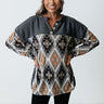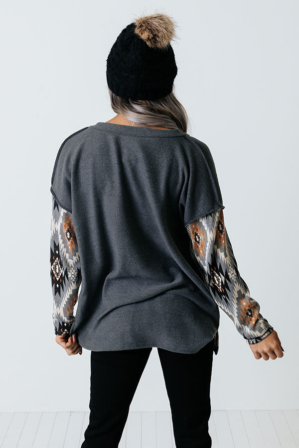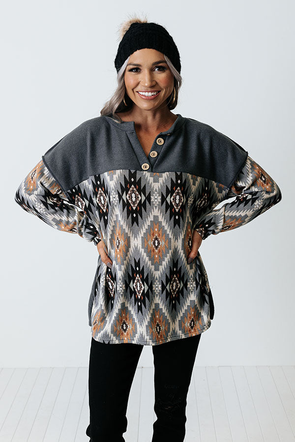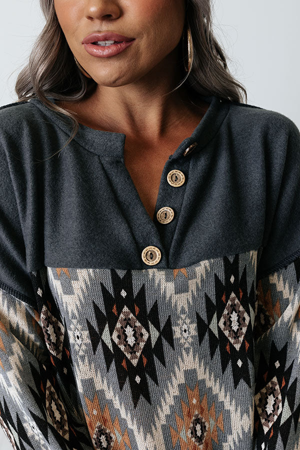 You are sure to turn heads in our eye-catching charcoal hued 'Telluride Tales Shift Top' featuring soft material patterned with a unique navy, blue, and rust hued aztec print, a button up bodice with a rounded neckline, long loose sleeves, and a relaxed silhouette that falls into a straight hemline with accent side slits! Measurements