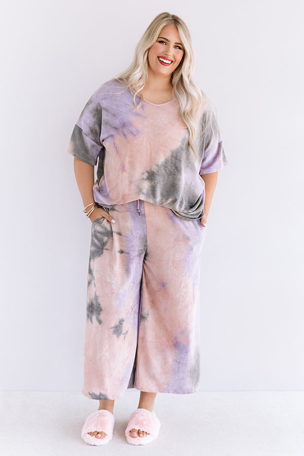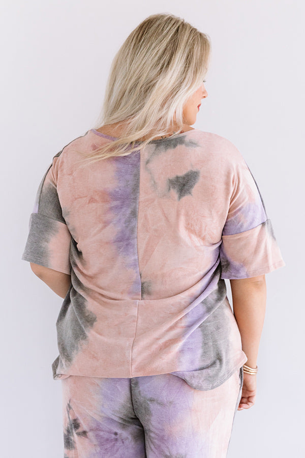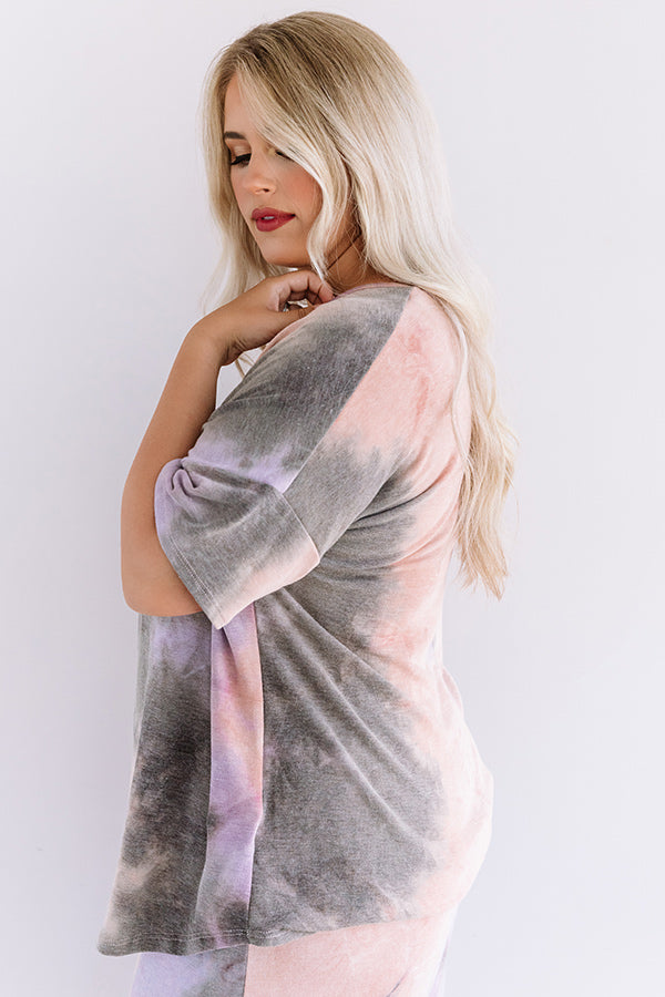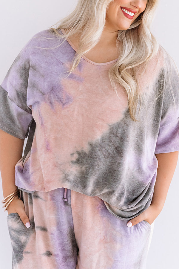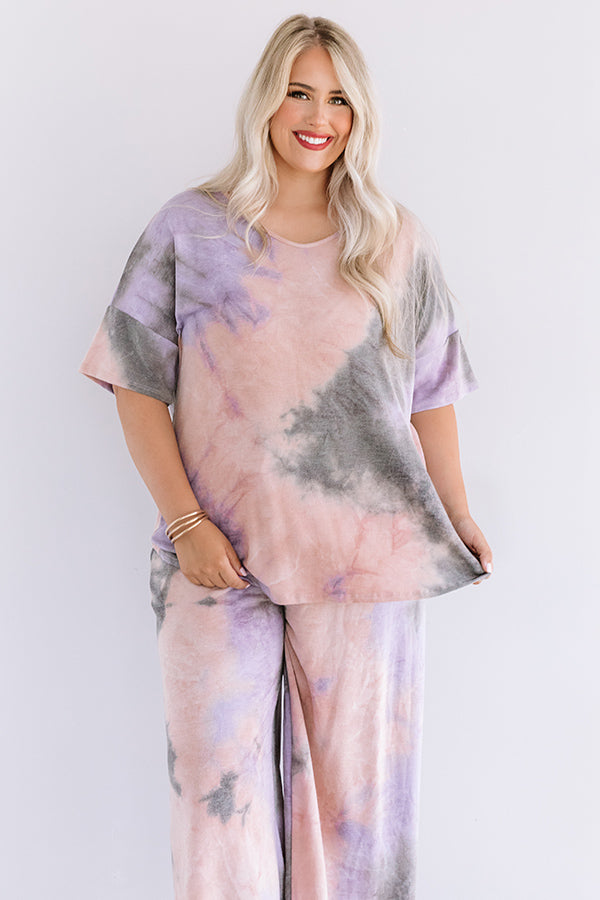 Plus Size - You will feel like you are relaxing on a cloud when you wear our adorable "Tender Heart" shift tee featuring ultra soft lightweight material patterned with blush and purple hued tie dye, a high rounded neckline, short loose sleeves, and a relaxed silhouette that falls into a rounded hemline! This comfy piece styles perfectly with our matching "Tender Heart Tie Dye Pants in Blush," a scrunchie, and some fuzzy slippers for the ultimate two-piece lounge look!