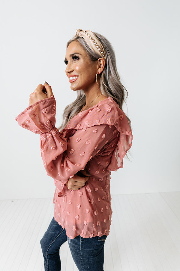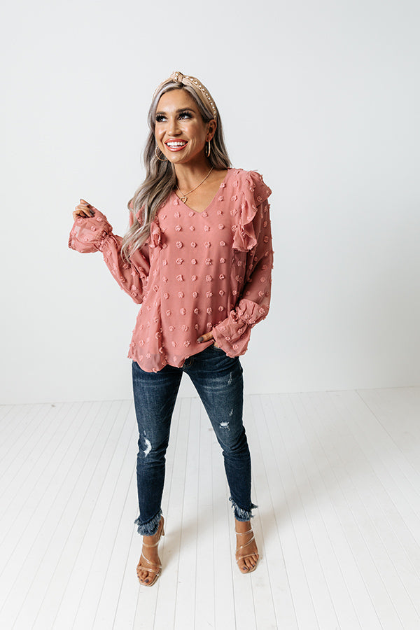 People are sure to make a toast at how amazing you look when you complete your outfit with this beautiful dusty rose hued shift top featuring lightweight material with polka dot texturing, a v-cut neckline, long bishop sleeve with flared cuffs and ruffled shoulder accents, and a relaxed silhouette that falls into a straight hemline!