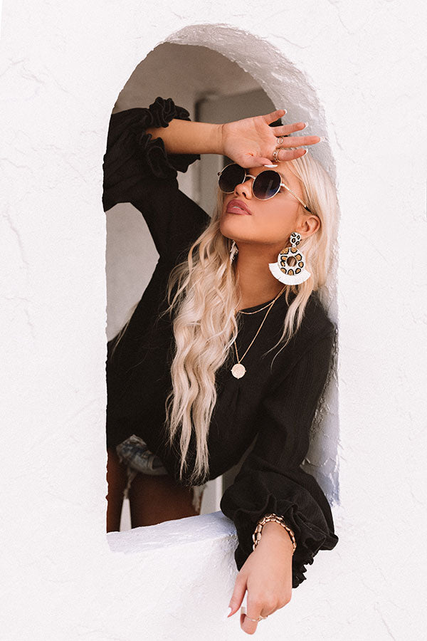 Take your accessories for a stroll on the wild side with our luxe 'Tequila Sunrise' statement earrings featuring beaded leopard print studs and wide flat dangling hoops with white tassel fans!