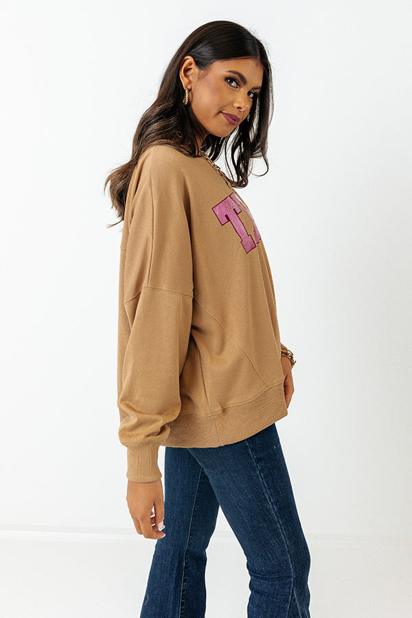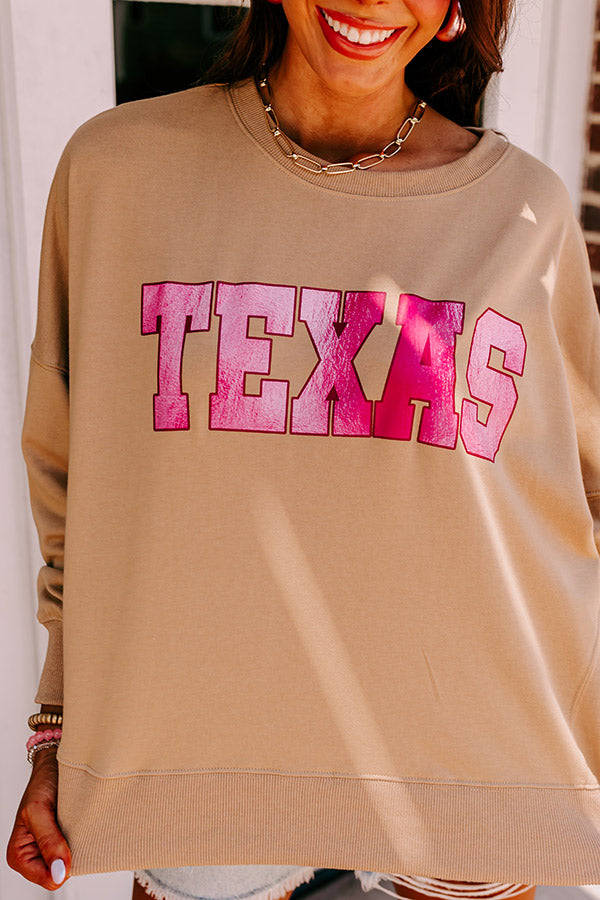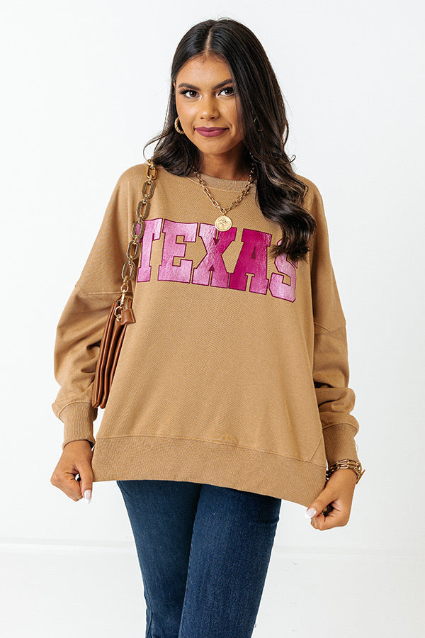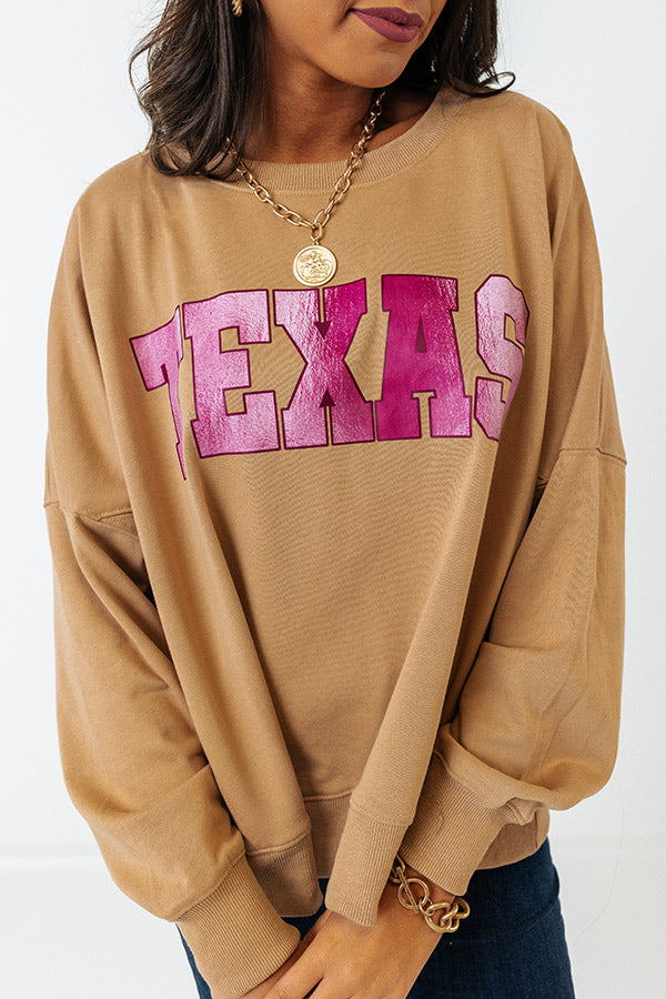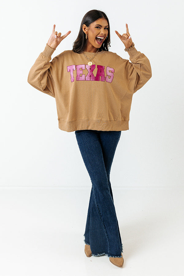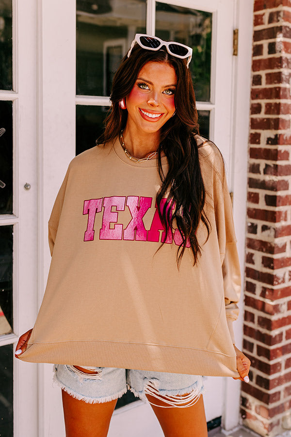 Calling all Texas girls! This lightweight 'Texas' graphic sweatshirt in its cozy oversized fit is perfect for crisp fall days. Features long sleeves with fitted ribbed cuffs that compliment the ribbed bottom hem and round neckline.