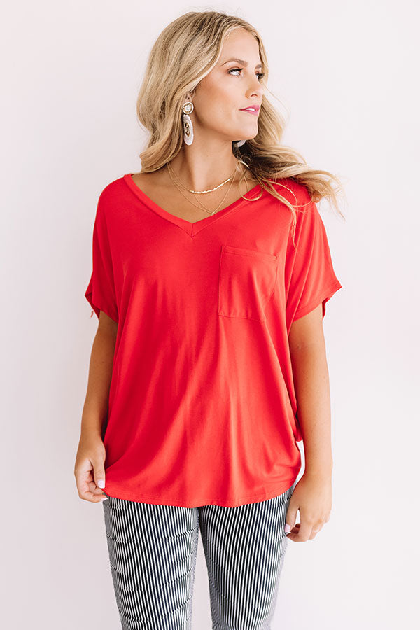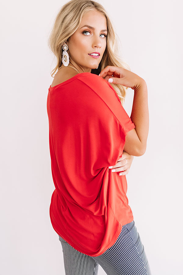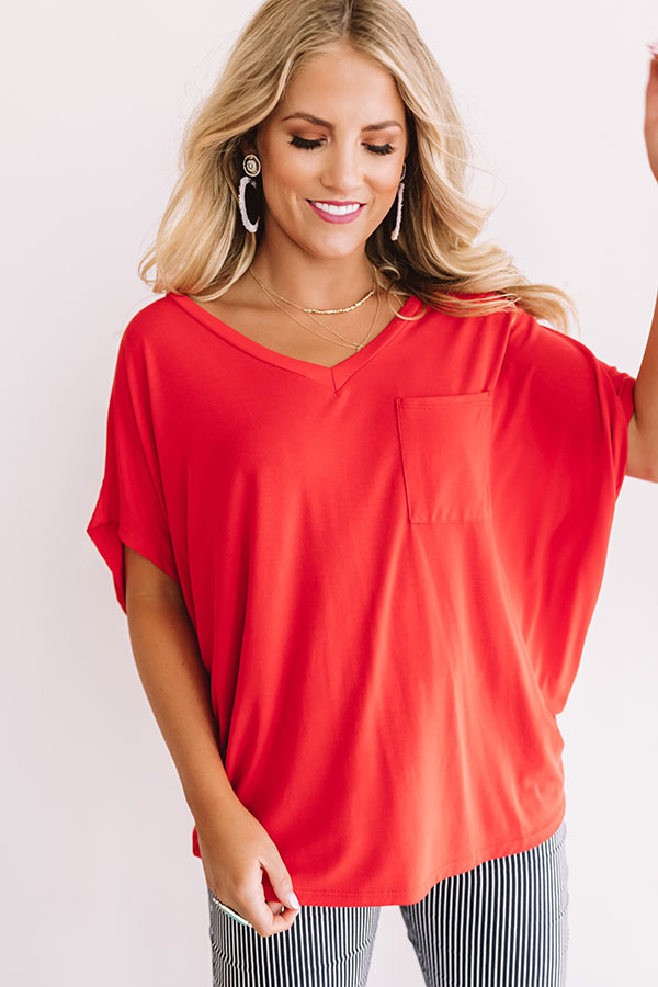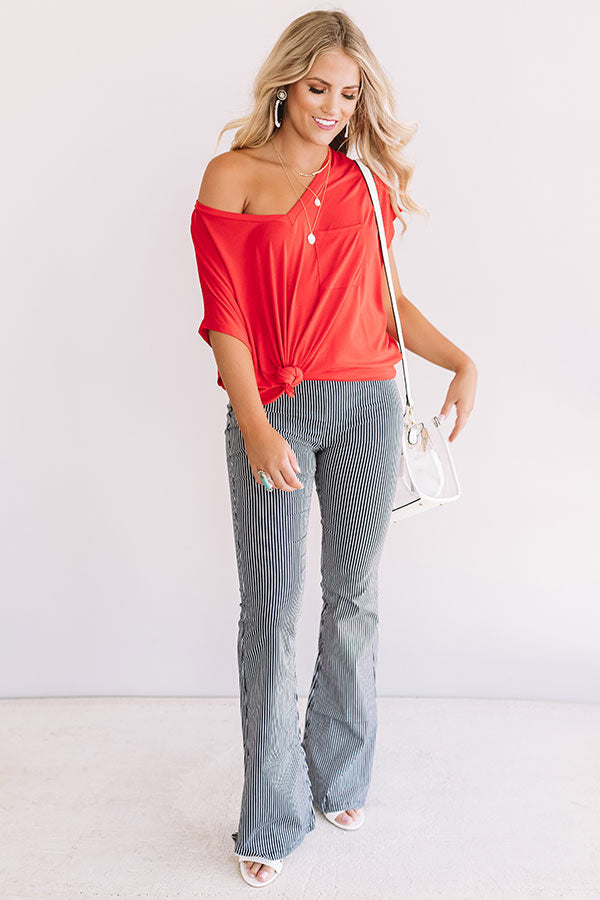 This red boyfriend tee will have you saying TGIF with its short sleeves, knotted front hem, and v-neck that can be worn off one shoulder! You can wear this shirt with some pin stripe flares, white heels, and a transparent bag for a trendy gameday look or with our "Clara High Waist Distressed Shorts" and "The Byrdie Wedge in Red" for a more everyday weekend outfit!
