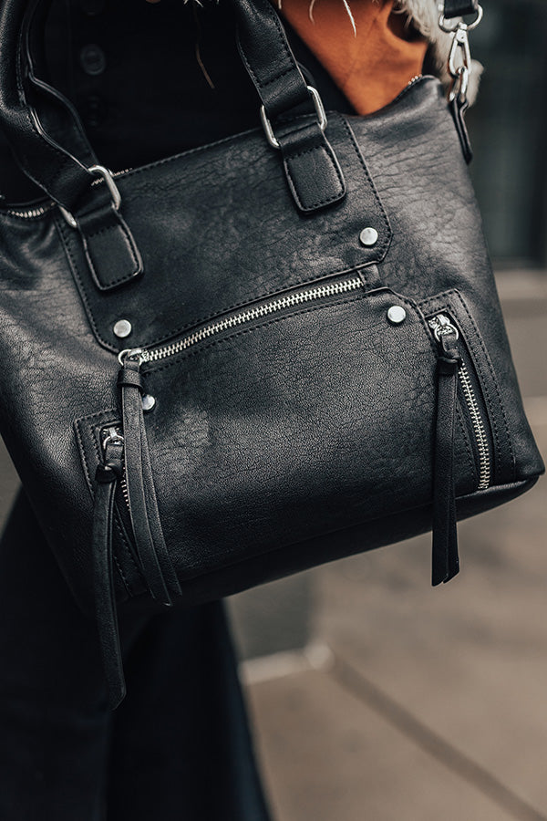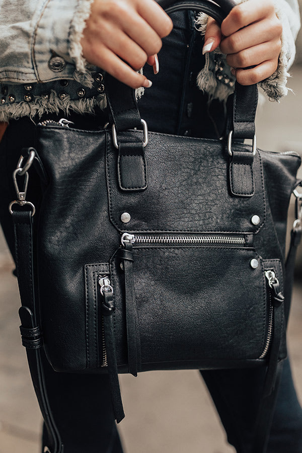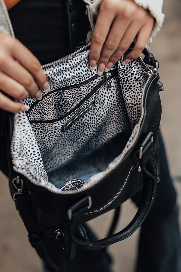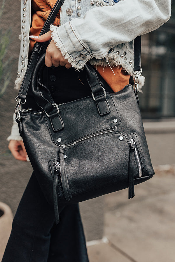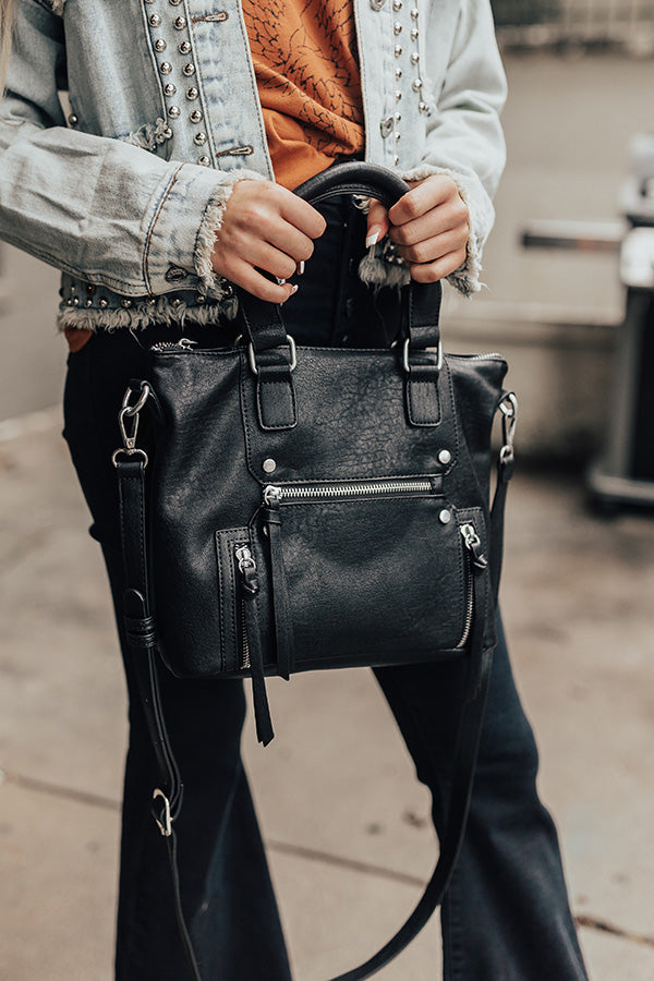 You won't find a more practical fall bag than our black 'Thankful Thoughts' crossbody featuring faux leather material, two handles, a removable and adjustable shoulder strap, a zip closure pocket on the front with two zipper accents and a an extra zip closure pocket on the back, and a spacious fully lined zip closure pouch with an additional zip closure pocket on the inside!